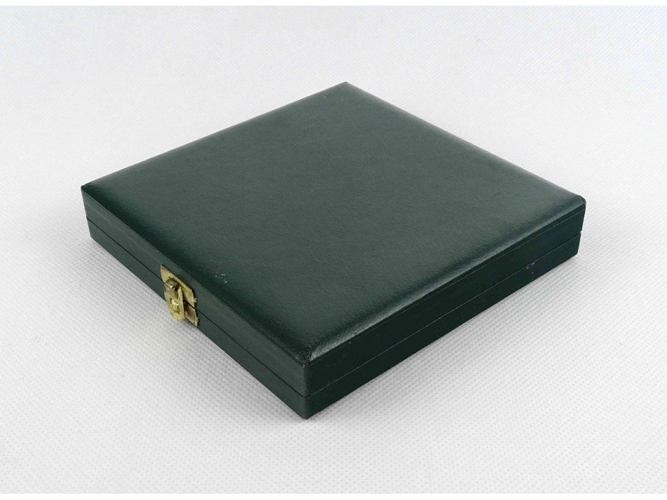 Régi, két oldalas, plasztikus díszítésű Magyar Gyógyszerészeti Társaság réz plakett, zöld bőr borítású díszdobozban.