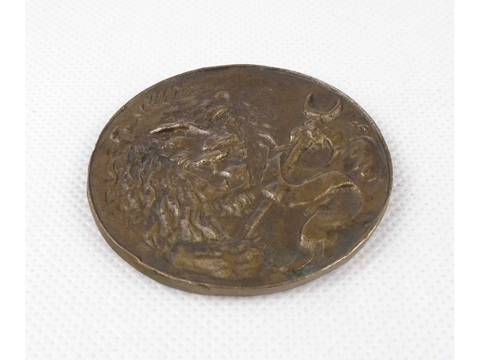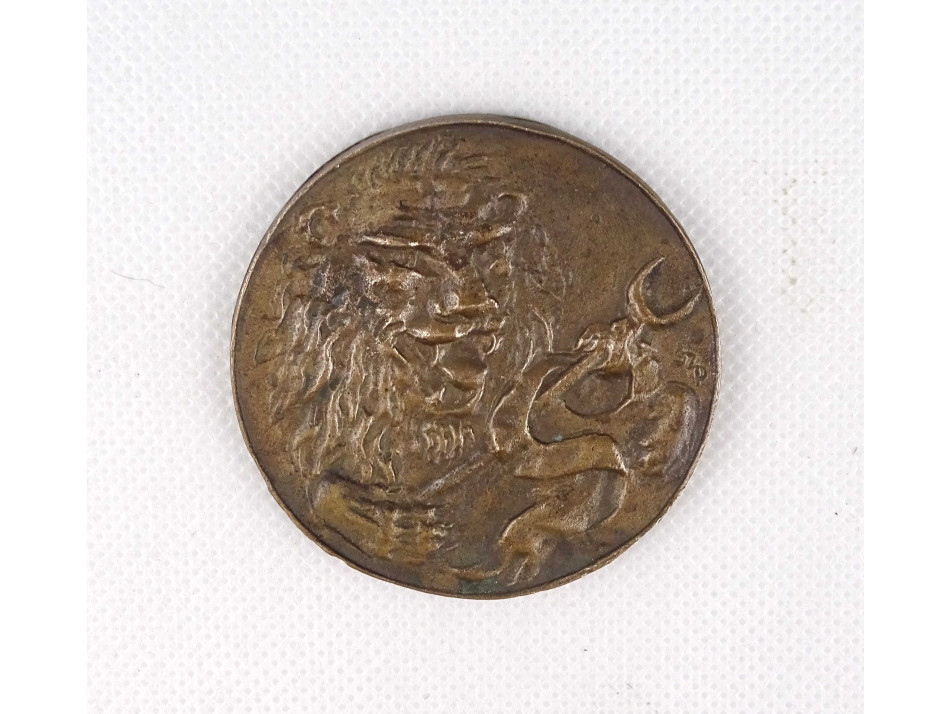 Kétoldalas, jelzett, bronz plakett, emlékplakett. Rajta lófarkas, félholdas török zászlót ledöntő oroszlán képe, másik oldalán felirat.