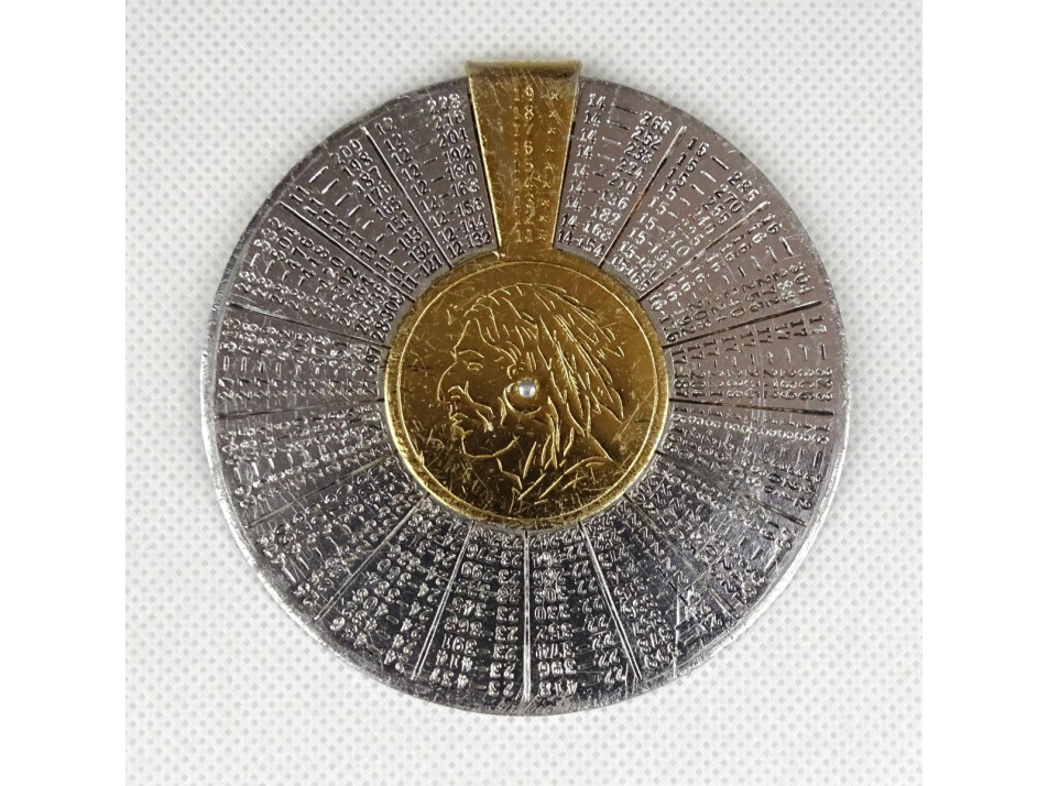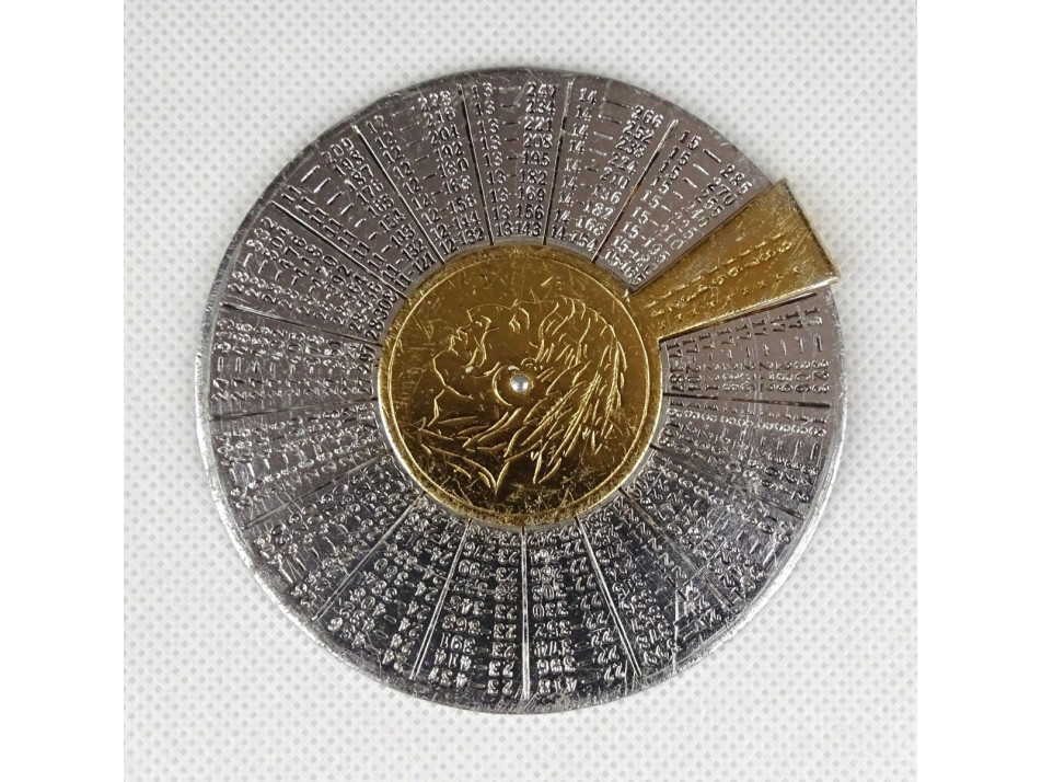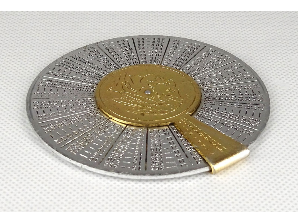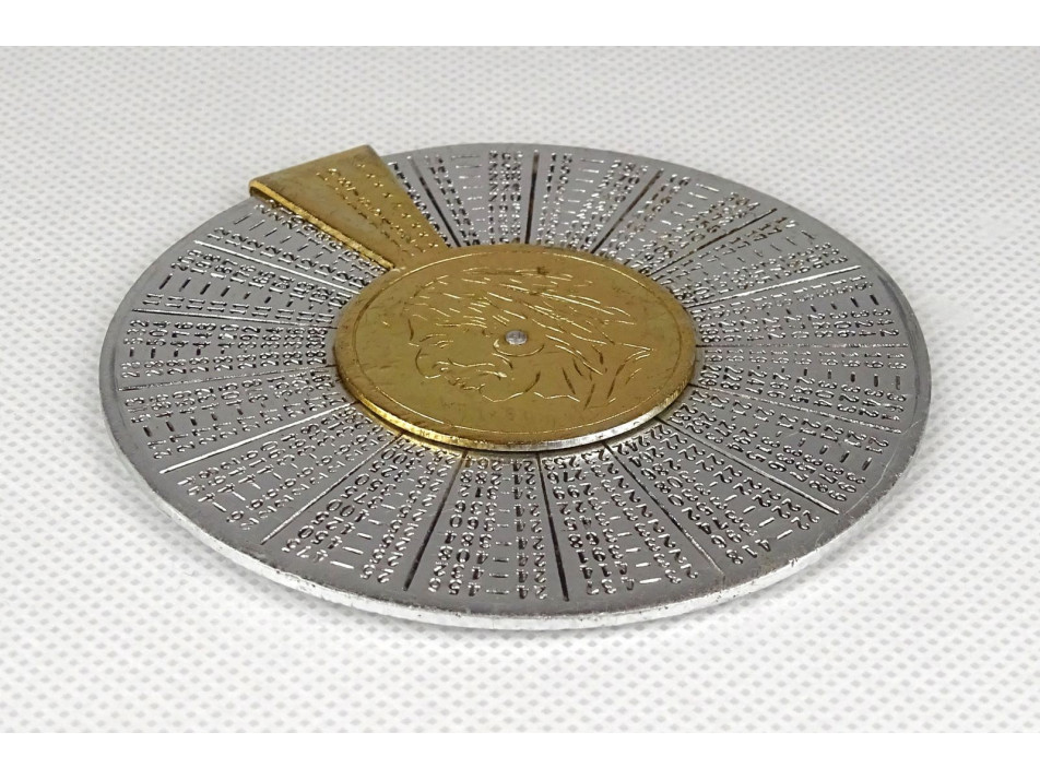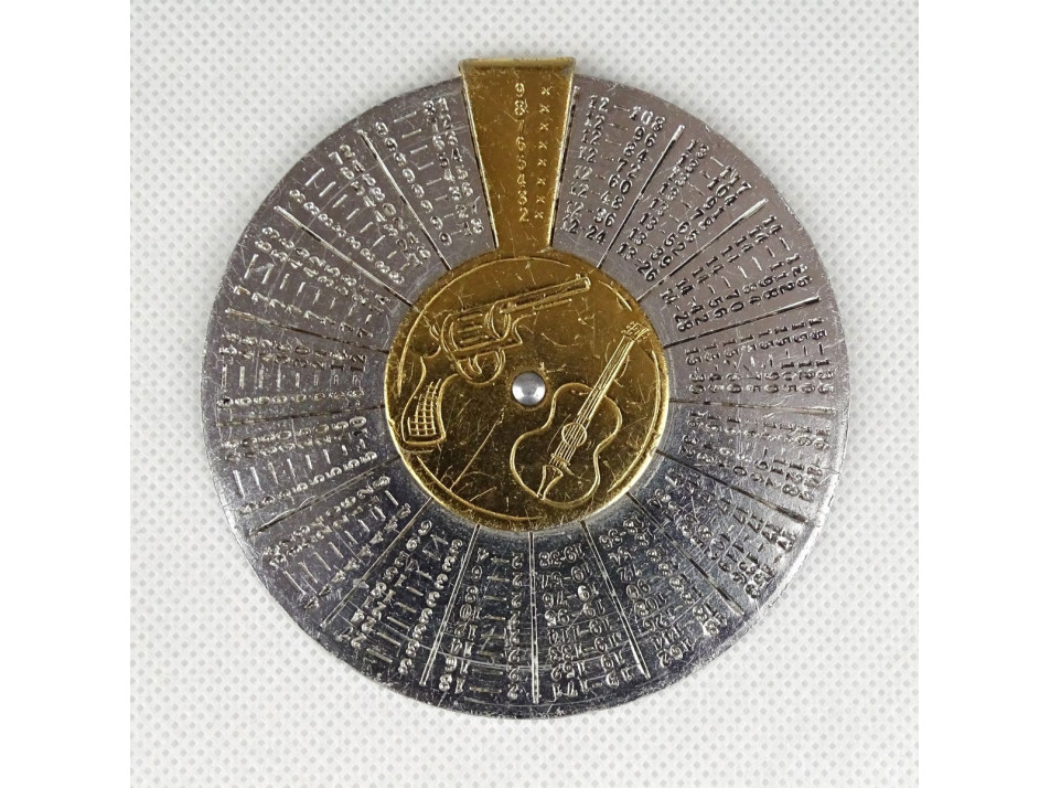 Retro különleges "számológép", szorzótábla puska. Alumíniumból készült, egyik oldalán karcolt indiánfej, másik oldalán revolver és hegedű díszítéssel. A legnagyobb művelet rajta: 19 x 28 = 532