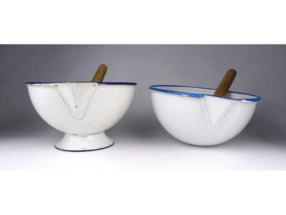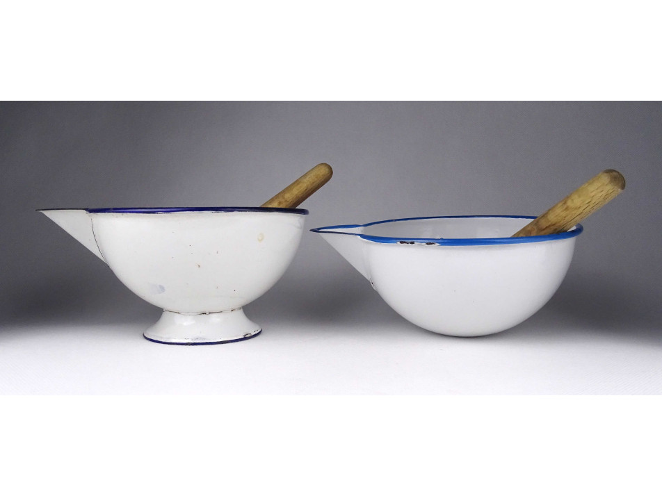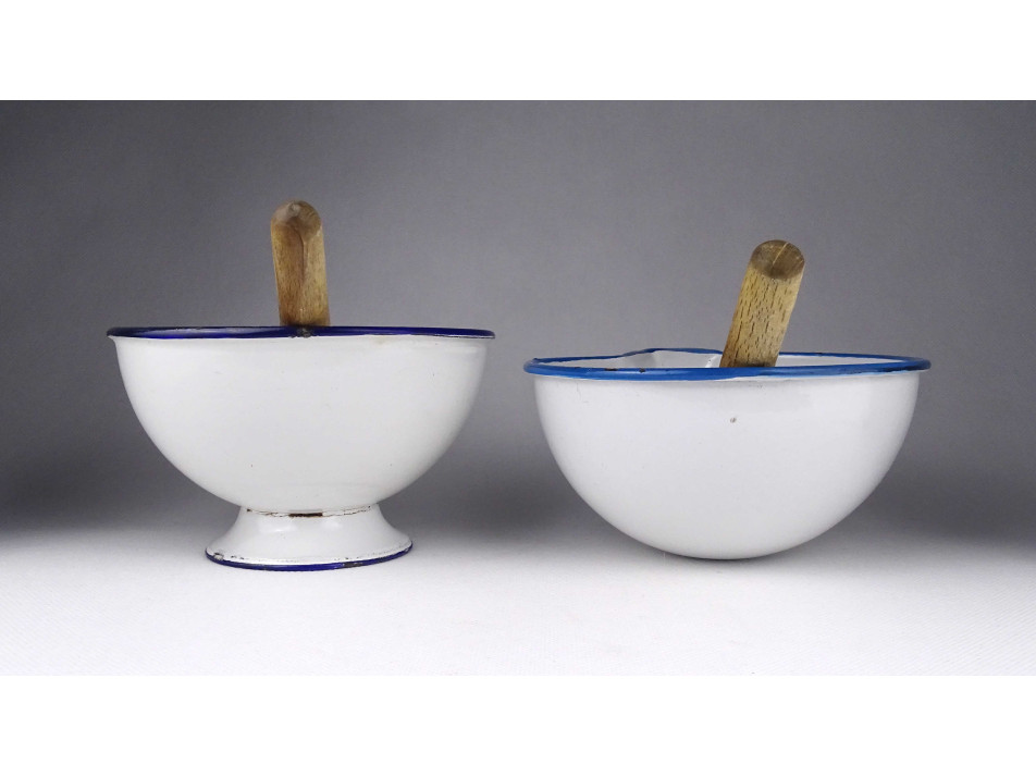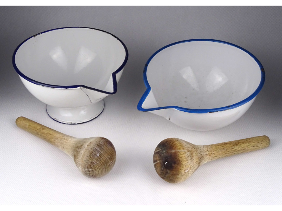 Régi, hibátlan állapotú, zománcozott fém keverőtál pár, labor felszerelés. Két darab gyógyszerész tál, patika edény a hozzájuk tartozó fa keverővel. Az egyik tál talpas, a másik félgömb alakú.