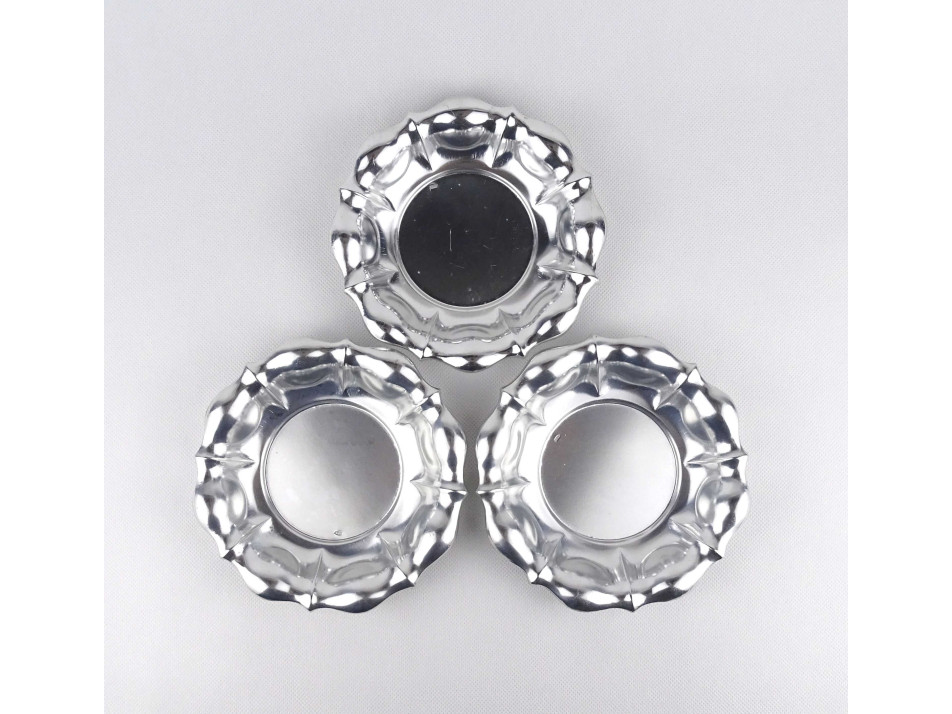 Régi, jelzett, hólyagos szélű, kör alakú fém kínáló tálca, kis tálca, fém tál szett, 3 darab egyben.