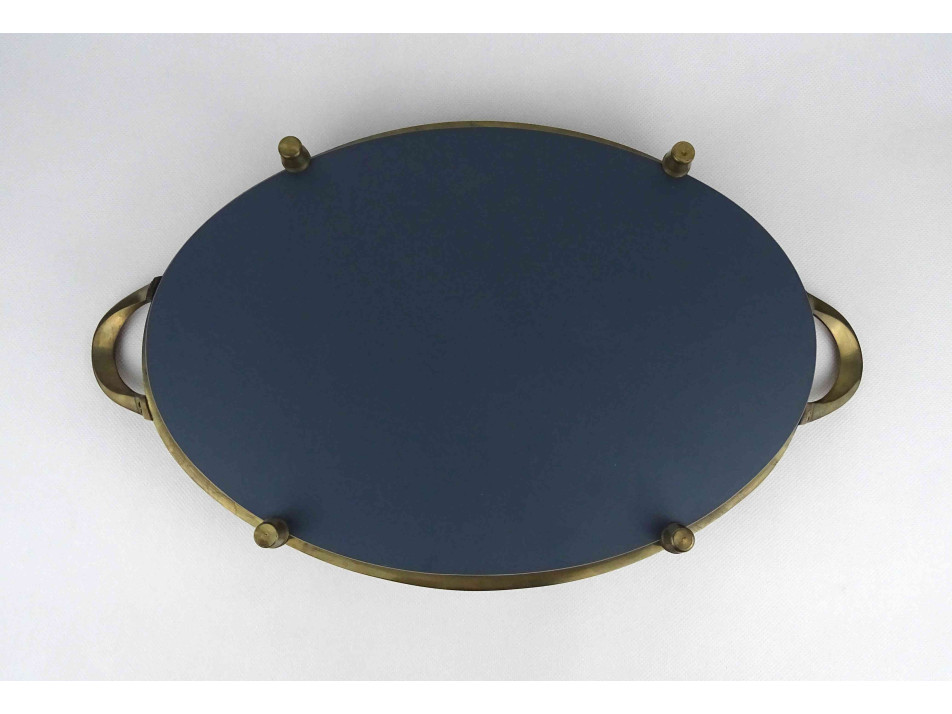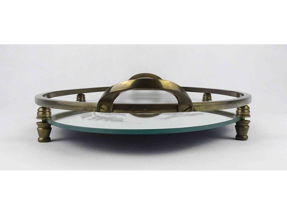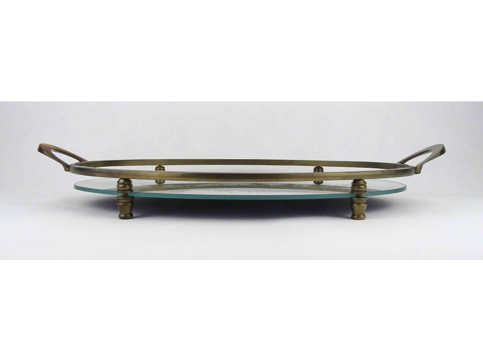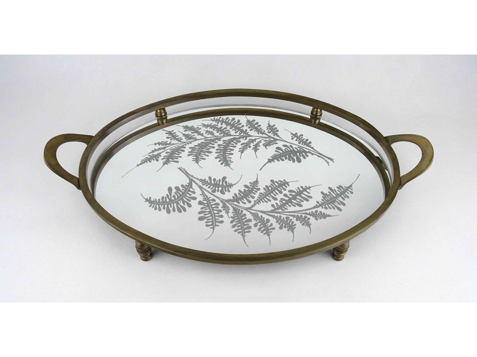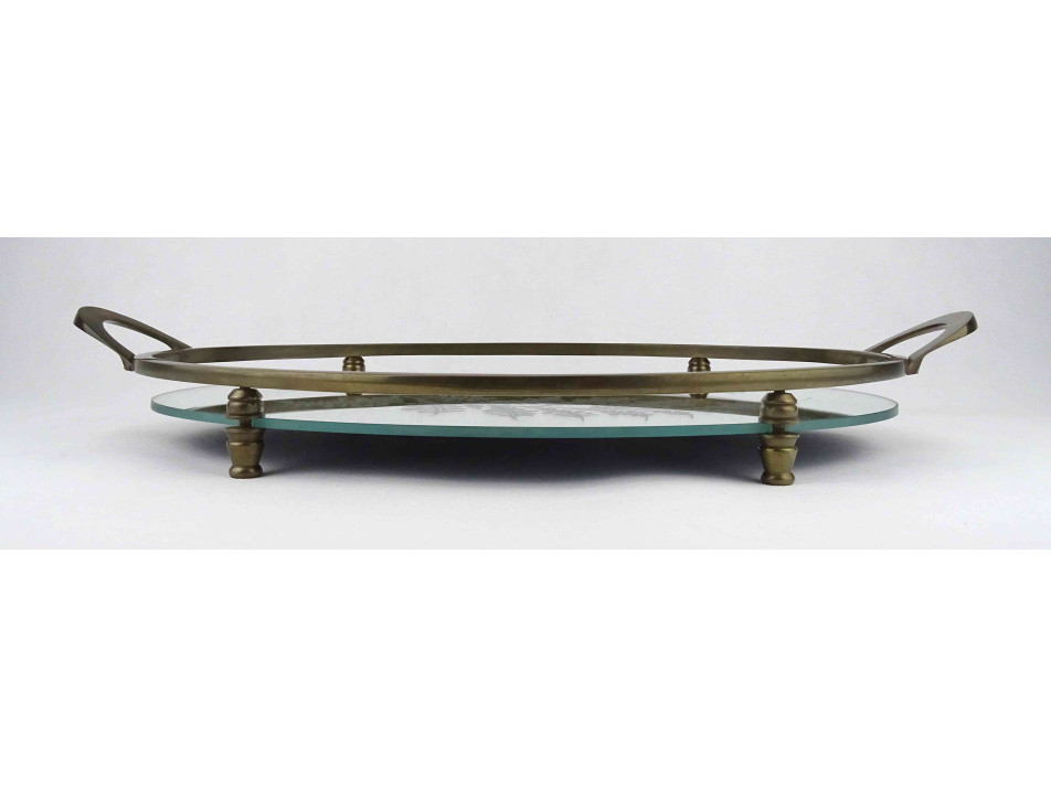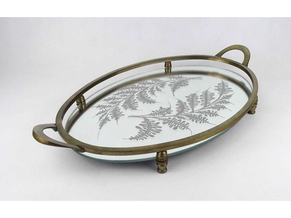 Régi nagyméretű, réz kerettel és fülekkel rendelkező, négy lábon álló tálca, kínáló tál, ovális alakú levélmotívummal díszített tükör betéttel.