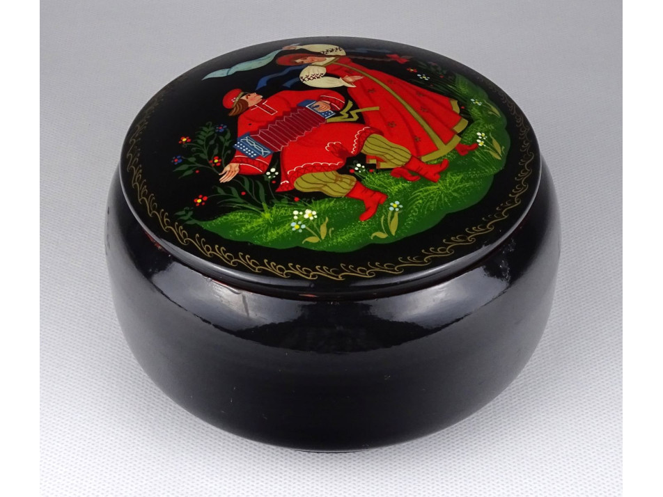 Régi, szép állapotú, fekete színű nagy méretű fém bonbonier, tároló doboz. Belseje pirosra festett, tetején kétalakos népviseletes táncos orosz kézzel festett jelenet látható.