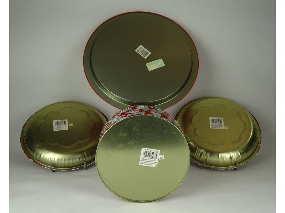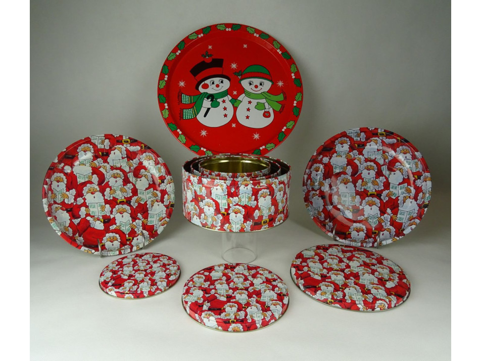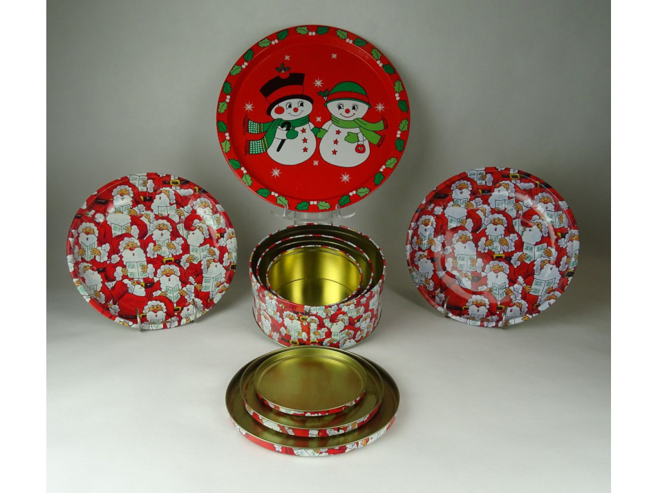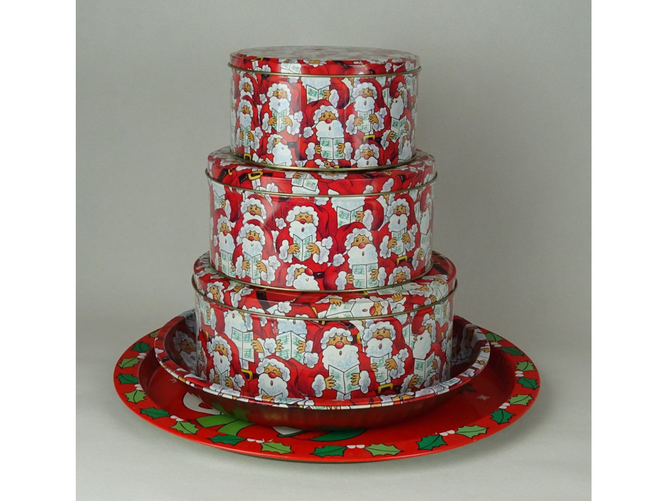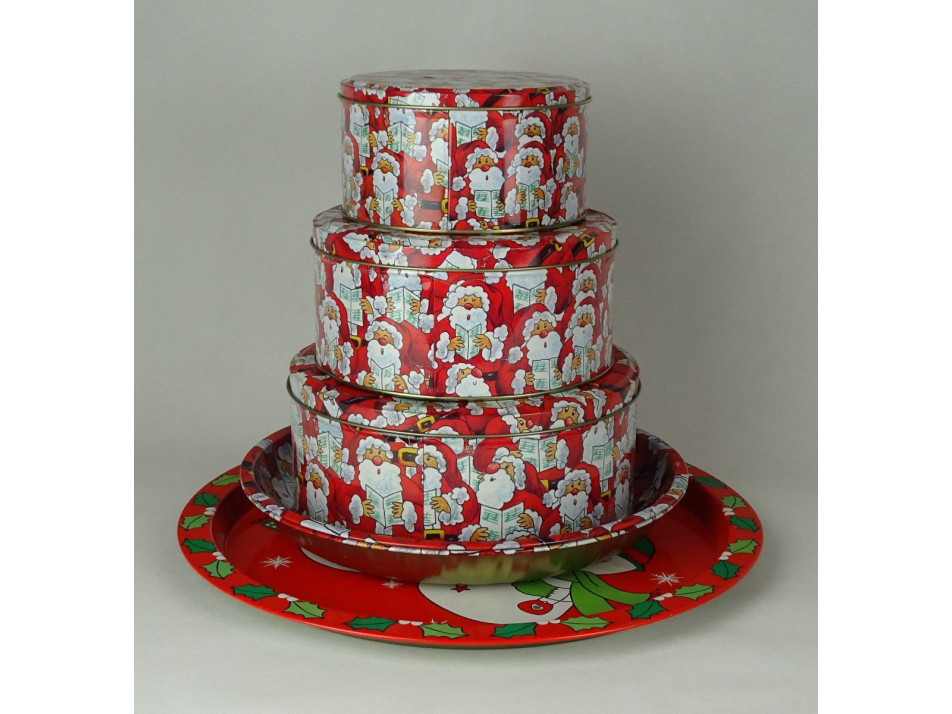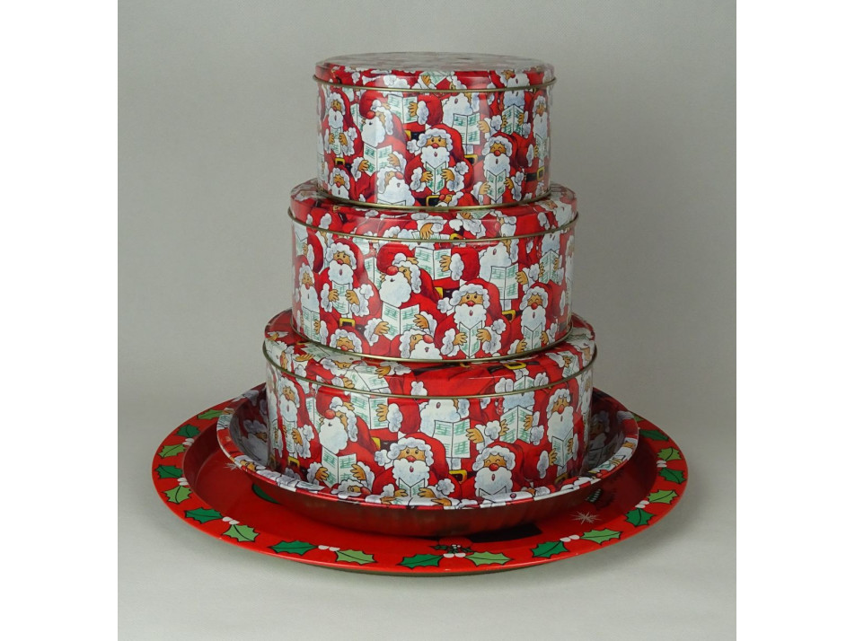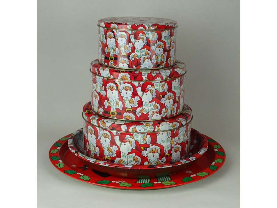 Mikulás mintás, három egymásba rakható fémdoboz, három tálcával.