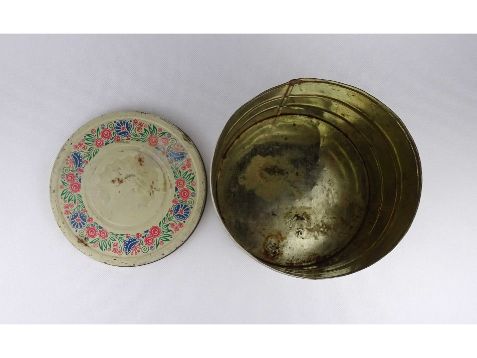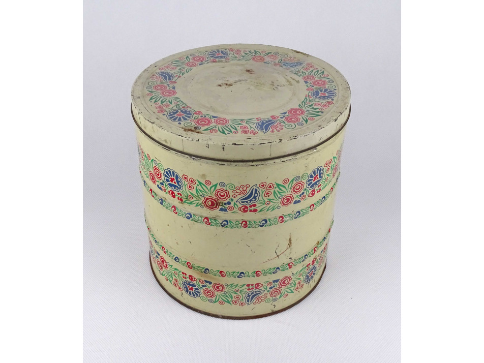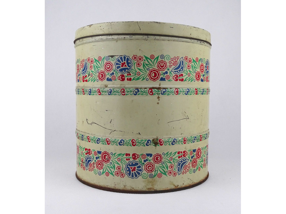 Régi, nagyméretű, magyaros virágmintás, lisztes pléh doboz 20.5 cm
