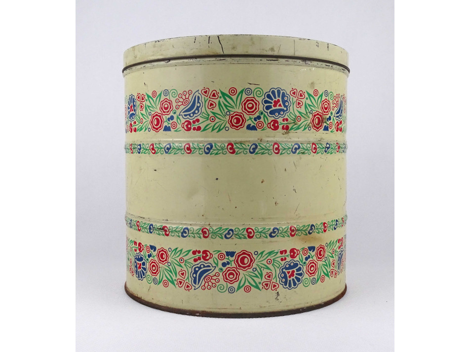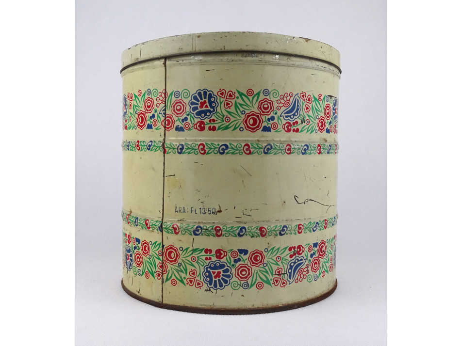 Régi, nagyméretű, magyaros virágmintás, fém fűszertartó, liszt tartó, konyhai tároló tégely, pléh doboz.