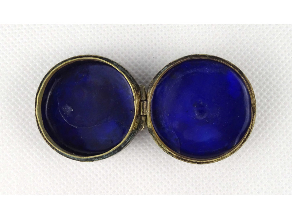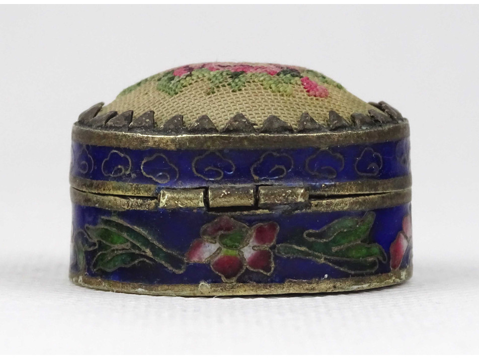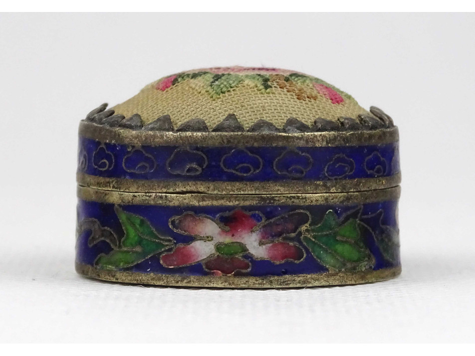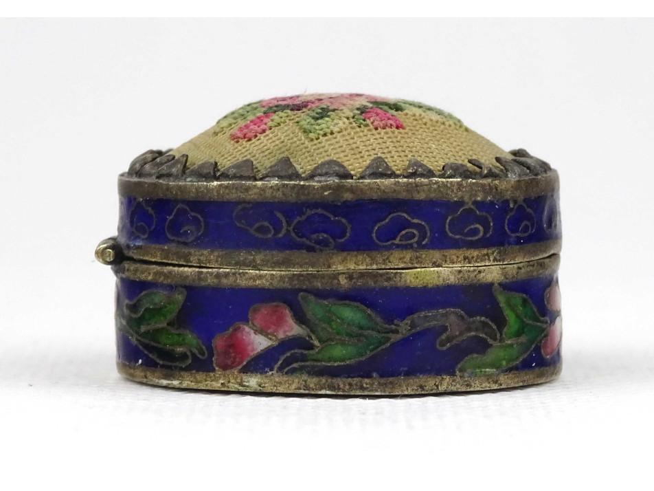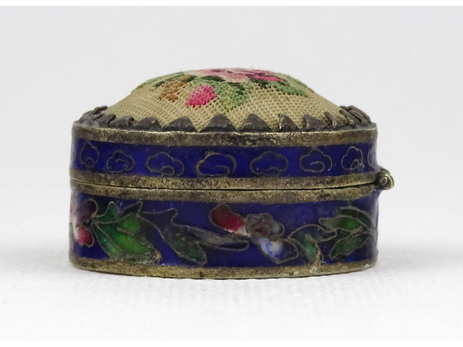 Hibátlan állapotú, kisméretű, fedelén hímzéssel díszített, fém testű, kék színű tűzzománc, rekeszzománc ékszertartó szelence.