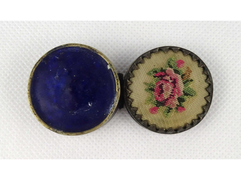 Antik hímzett fedelű, tűzzománc gyűrűtartó, ékszertartó szelence