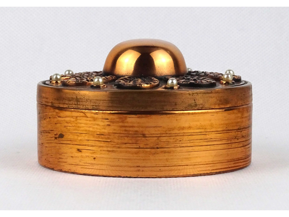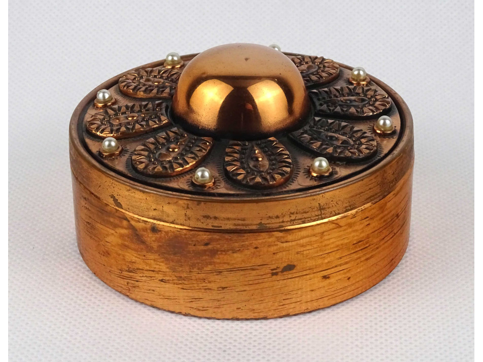 Hibátlan állapotú, köralakú iparművészeti vörösréz díszdoboz, ékszertartó doboz, zöld filc béléssel.
