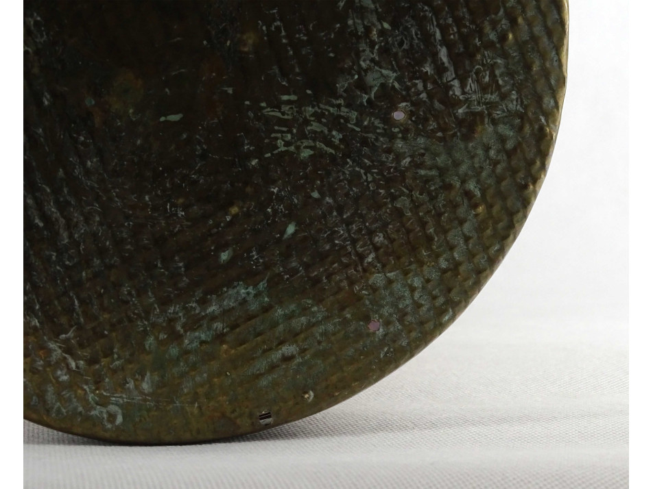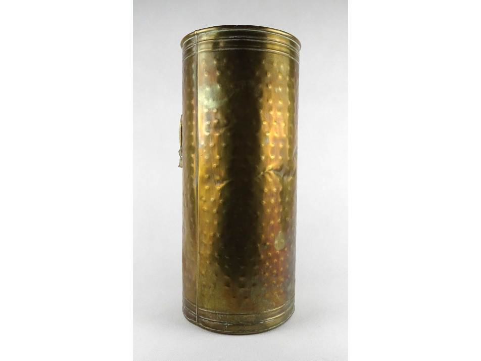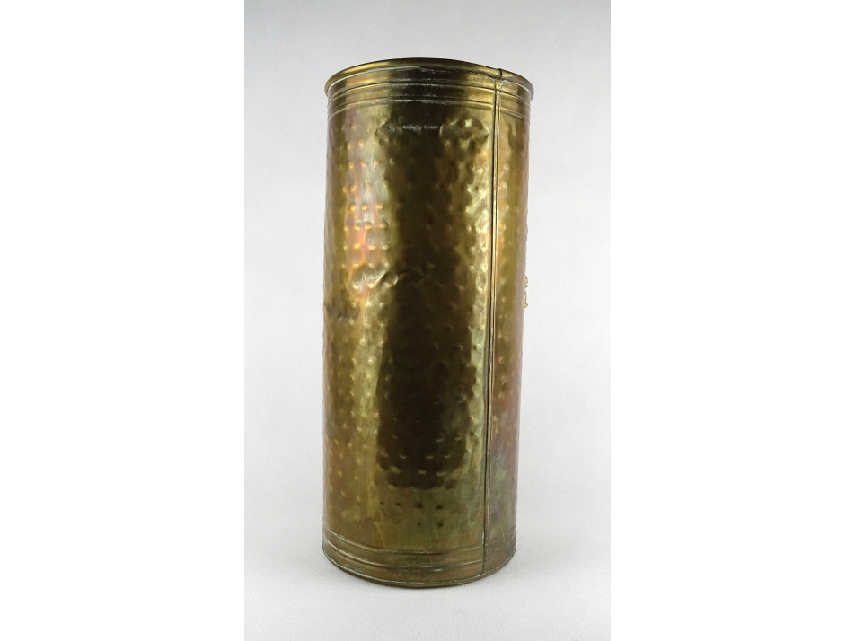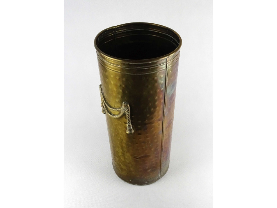 Régi, szép állapotú, sárgaréz lemezből készült, nagyméretű esernyőtartó. Oldalán plasztikus zsinórfűzér díszítéssel. A fenéklemezen néhány apró lyuk látható.