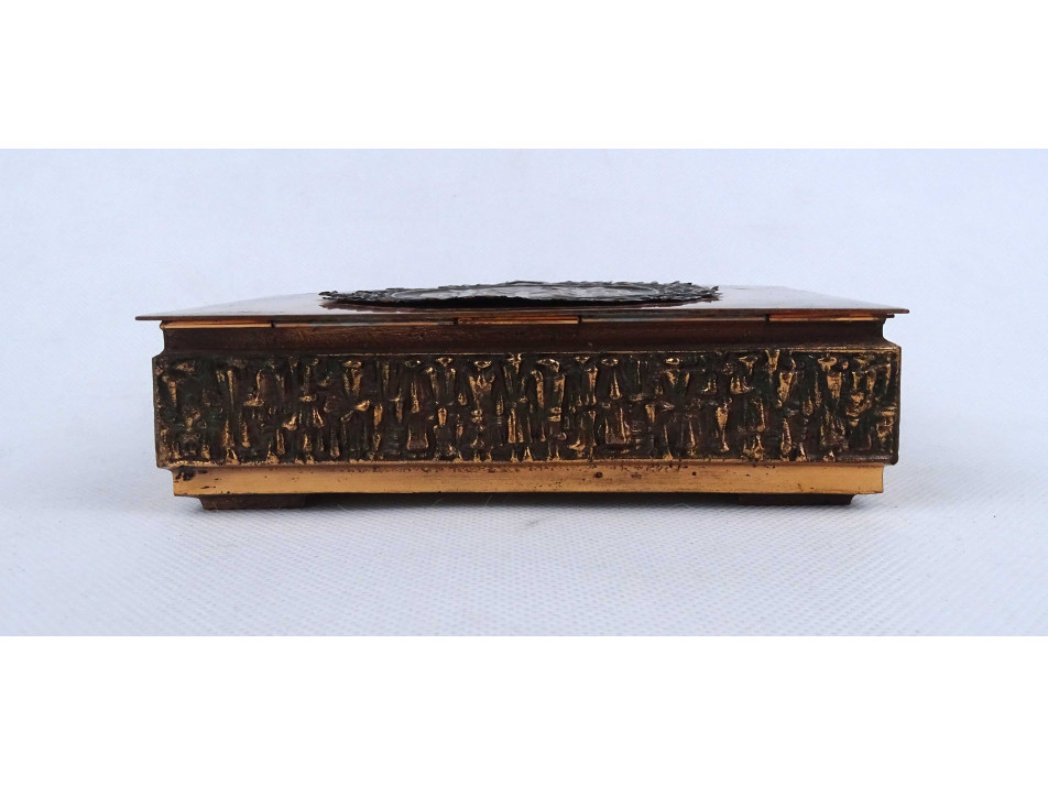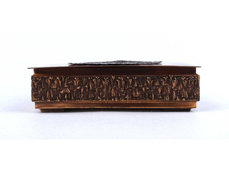 Retro, hibátlan állapotú, fa betétes, vörösréz díszdoboz, cigaretta kínáló doboz. Fedelén tölgyfa koszorúban katonai, légvédelmi eszközök, lokátor, rakéták és egy MIG 21 -es repülőgép, oldalán körben plasztikus emberalak díszítések láthatók.