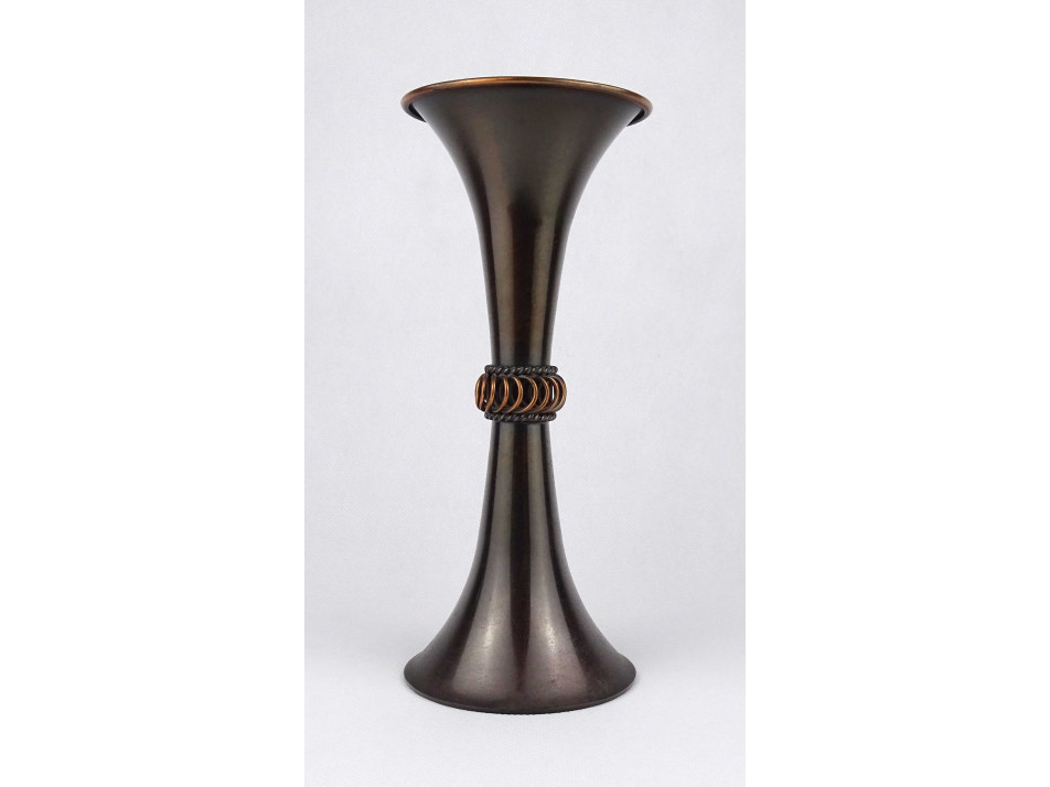 Hibátlan állapotú, ötvös vörösréz művészi váza, közepén plasztikus, fonott gyűrű díszítéssel.