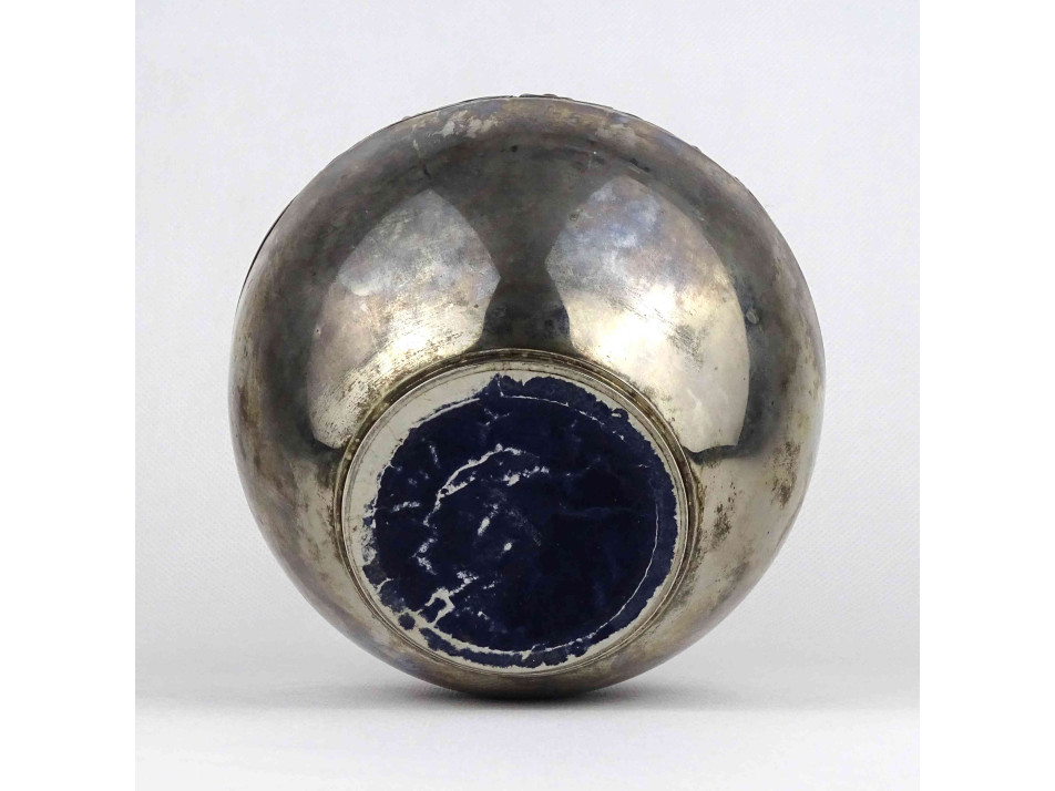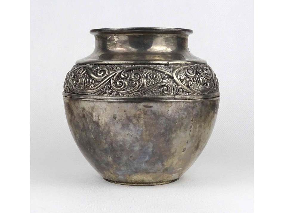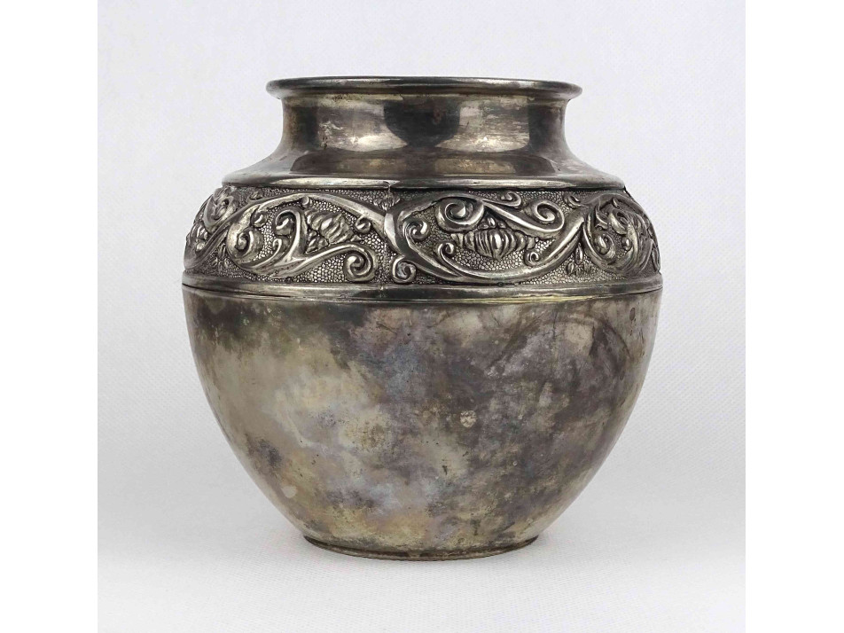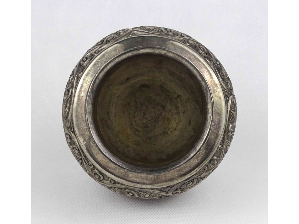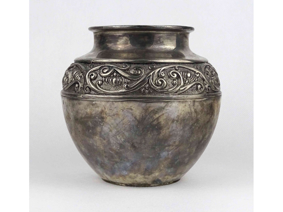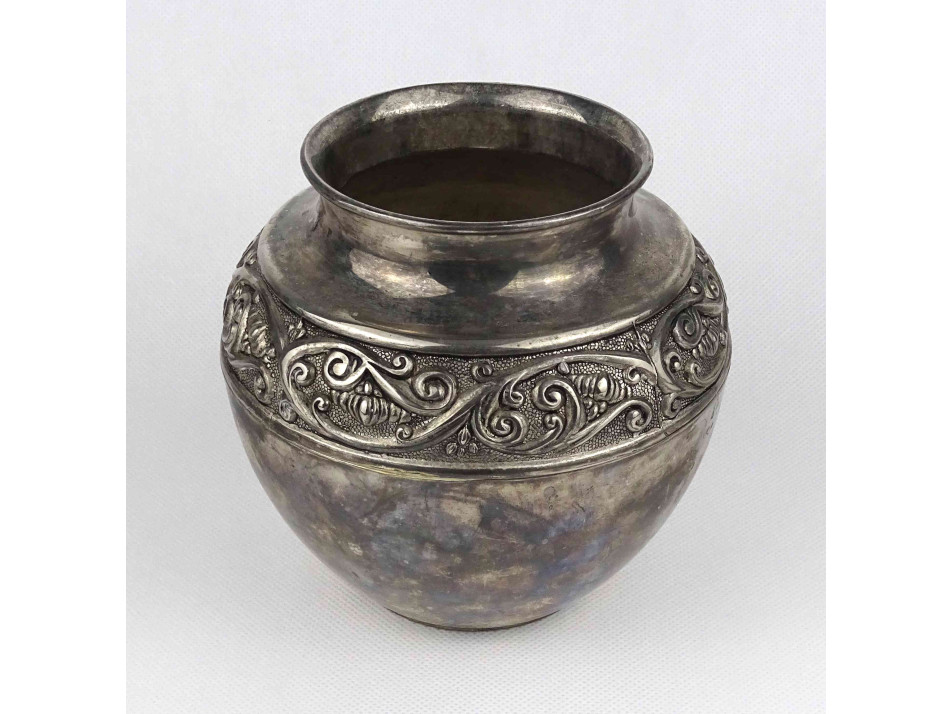 Régi, ezüstözött fém váza, öblös díszváza esetleg kaspó. Oldalán körbefutó stilizált növényi ornamentikus díszítés látható.