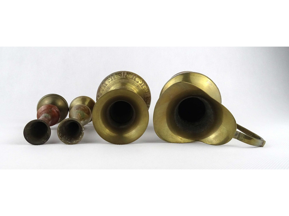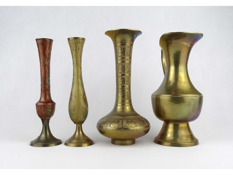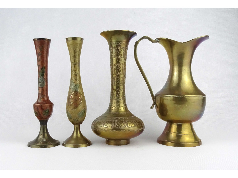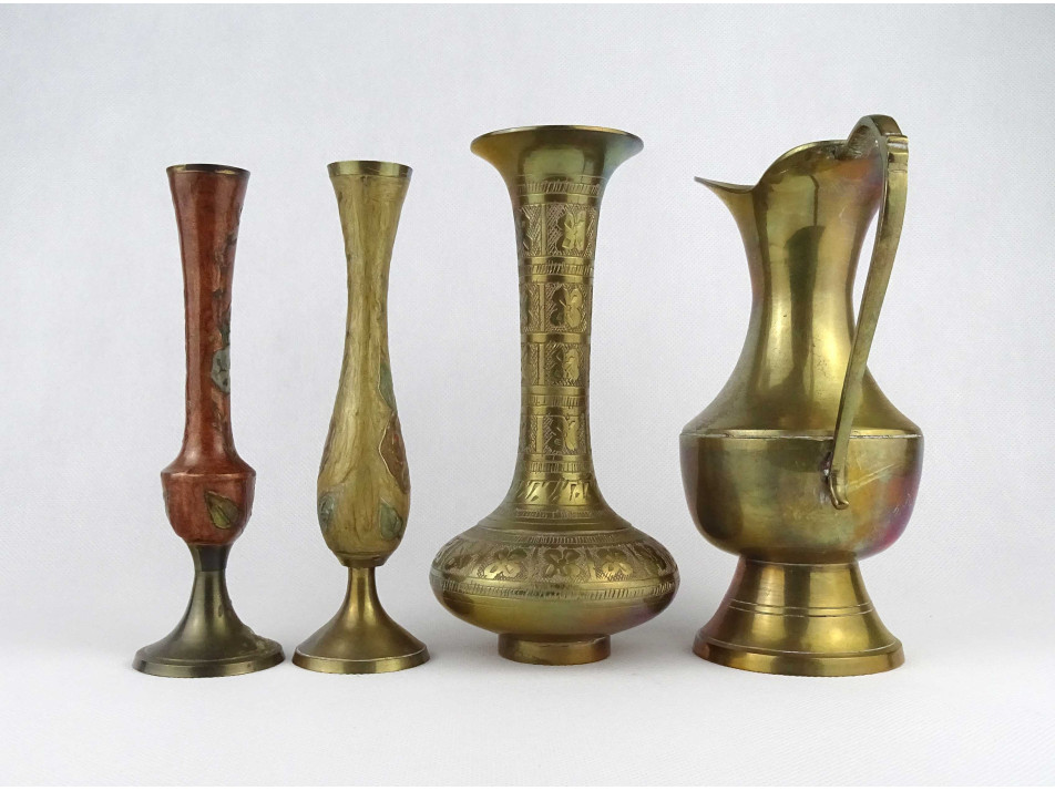 Régi, hibátlan állapotú, vésett és festett motívumokkal díszített keleti, indiai réz váza csomag, 4 darab egyben.