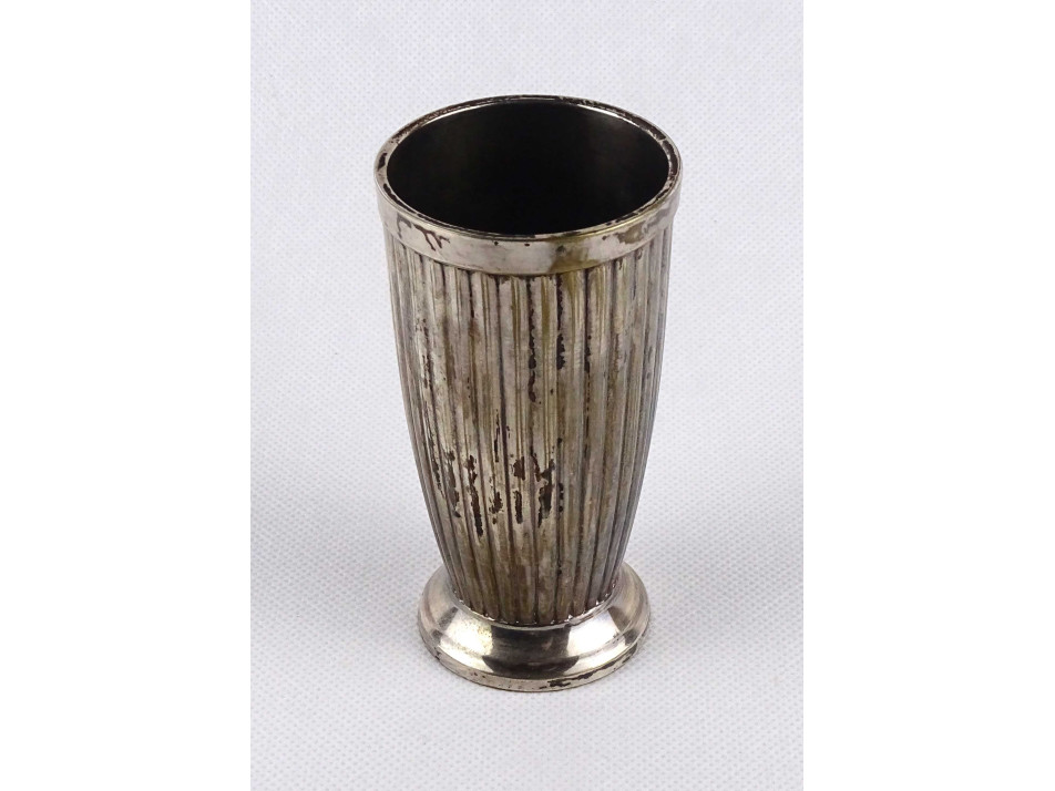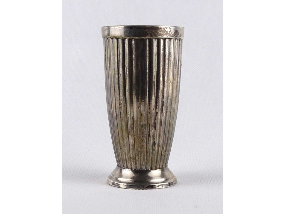 Régi, jelzetlen ezüstözött réz talpas kis váza, oldalán bordázott díszítéssel.