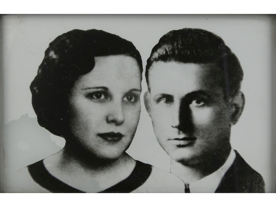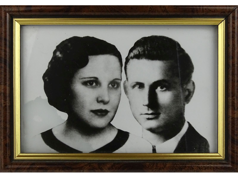 Régi, fekete-fehér női és férfi portré, családi fotográfia hibátlan állapotú keretben, üveglap mögött.
