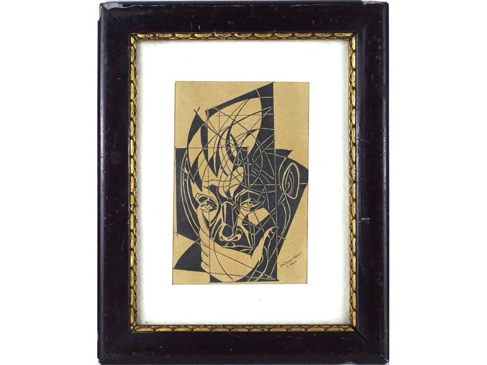 Papír tusrajz, paszpartuzva, üveglap mögött, szép állapotú barna keretben. Akasztási lehetőséggel rendelkezik. A keret felső sarkai sérültek.