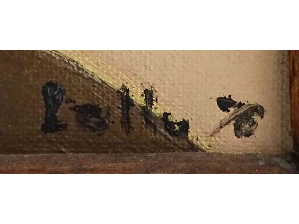 Jelzett, olaj farost festmény, virágcsendélet, szép állapotú széles barna fa keretben.