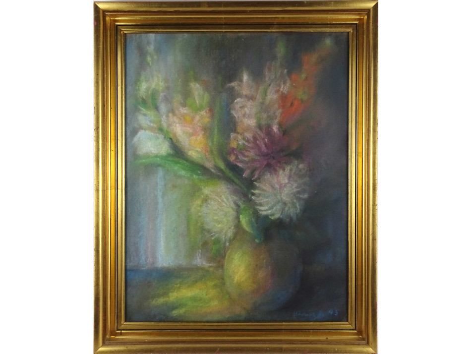 Papír pasztell kréta virágcsendélet, üveglap mögött, aranyozott keretben.