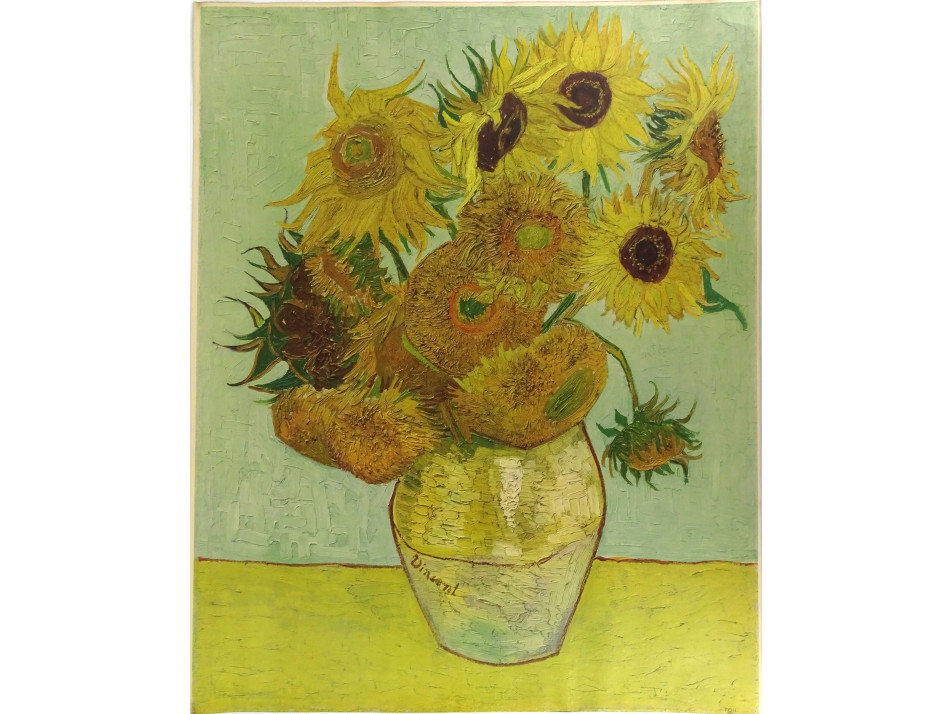 Vincent Van Gogh : Váza tizenkét napraforgóval című festményéről készült nagyméretű színes reprodukció, vastag papírra nyomtatott plakát, keret nélkül. Feltekerve tárolva.