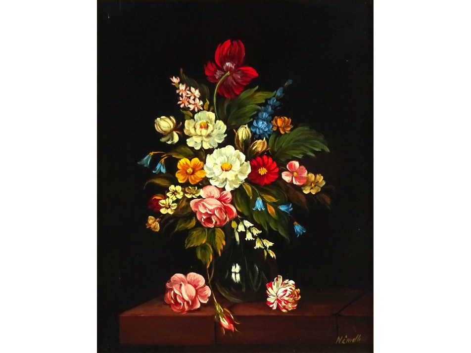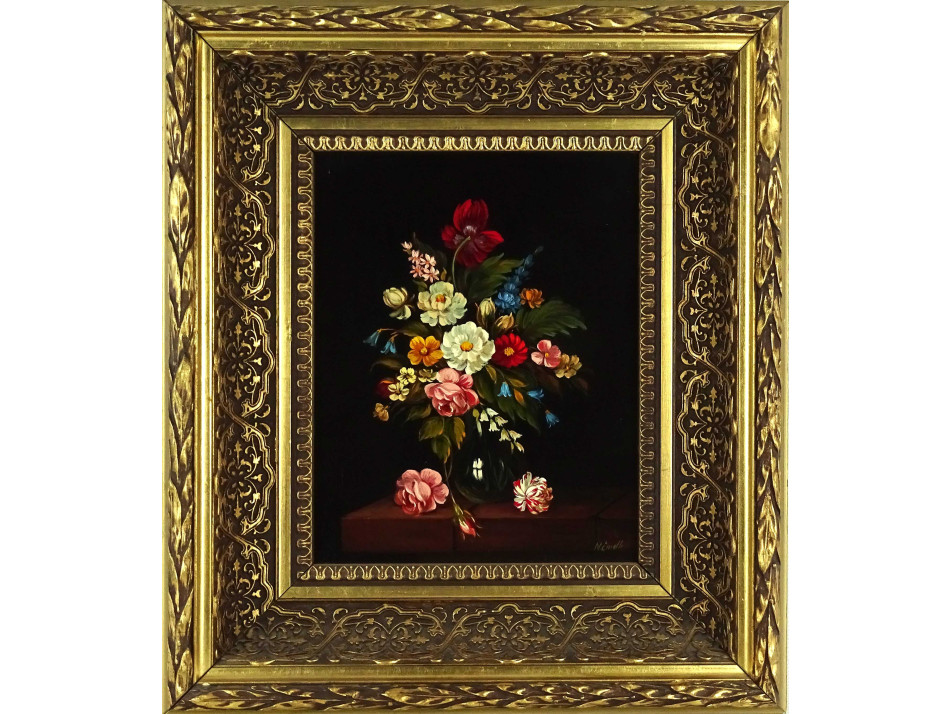 Jelzett olaj farost festmény, virágcsendélet, hibátlan állapotú széles, díszes aranyozott keretben.
