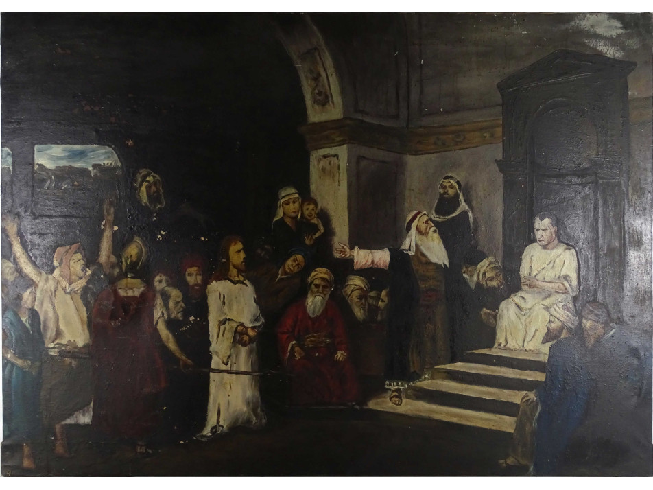 Munkácsy Mihály : Krisztus Pilátus előtt című festményének nagyméretű másolata. Szép állapotú olaj vászon festmény, keret nélkül. A festék több helyen is lepergett a vászonról.