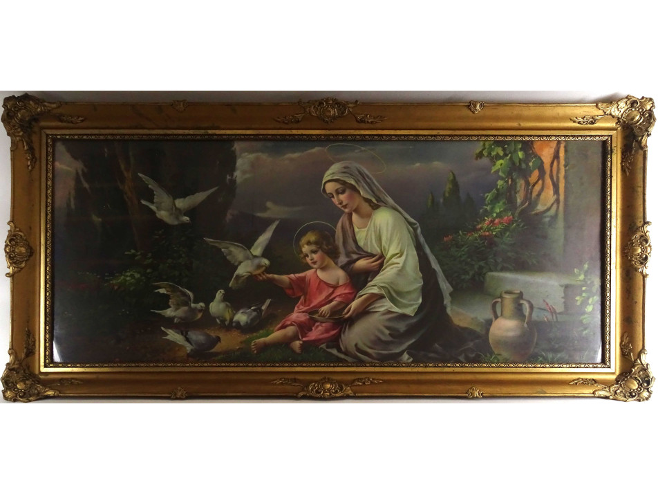 Galambokat etető kis Jézus és Szűz Mária szentkép olajnyomat
