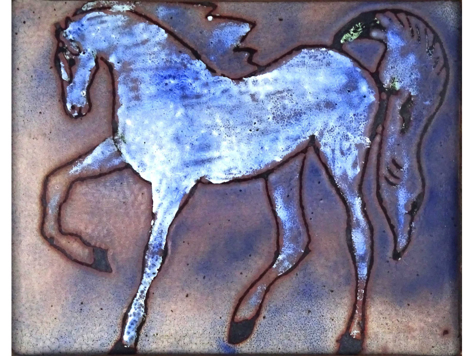 Magyar művész xx. század második fele. A fehér ló - tűzzománc kép 18 x 18 cm