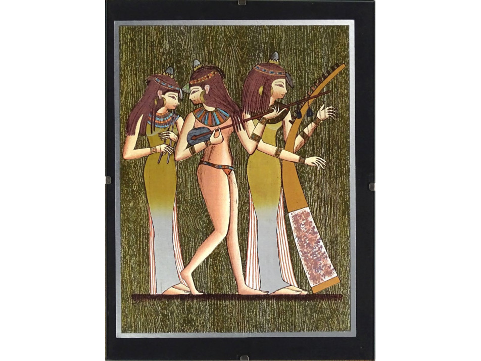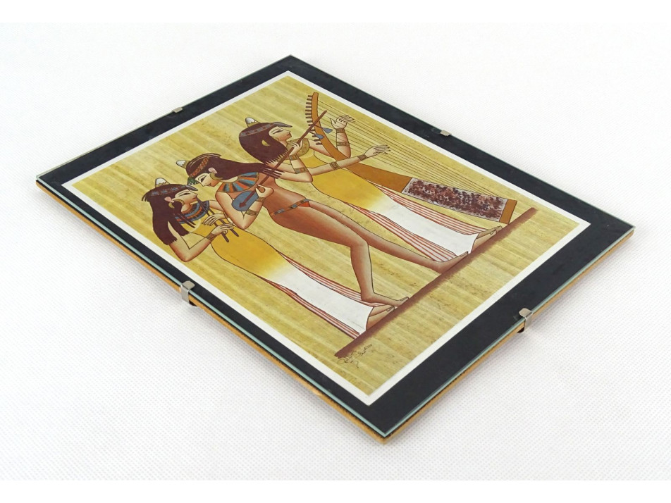 Üveglap mögött található színes egyiptomi témájú nyomdatechnika.
