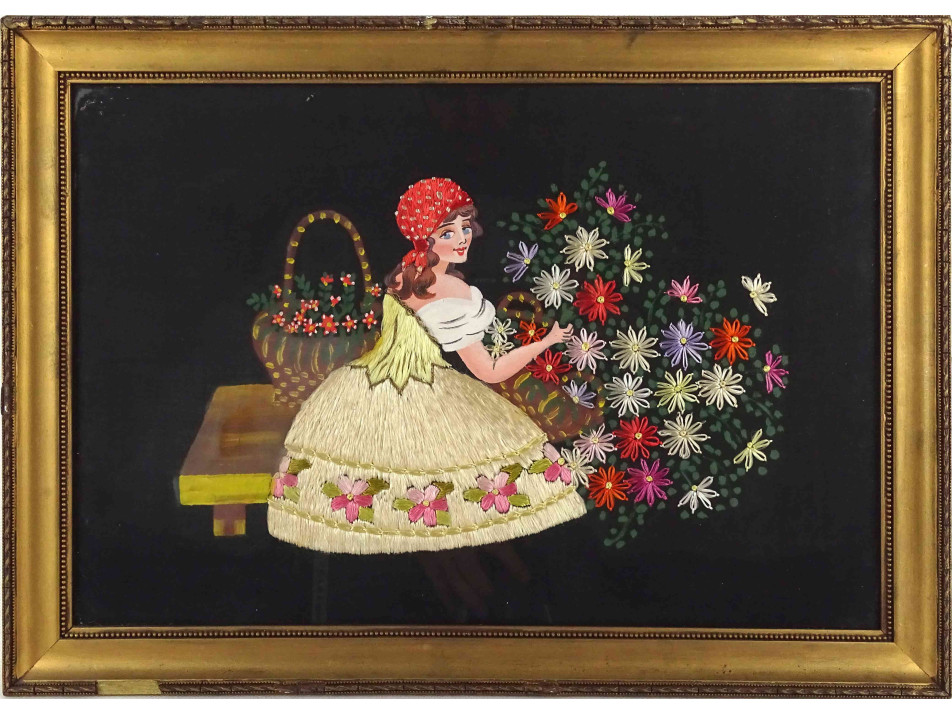 Régi, részben hímzett, festett selyemkép, díszkép , üveglap mögött, szép állapotú arany színű keretben. A képen egy fiatal lány, fiatal hölgy virágos bokor mellett virágkosárral a padon látható.