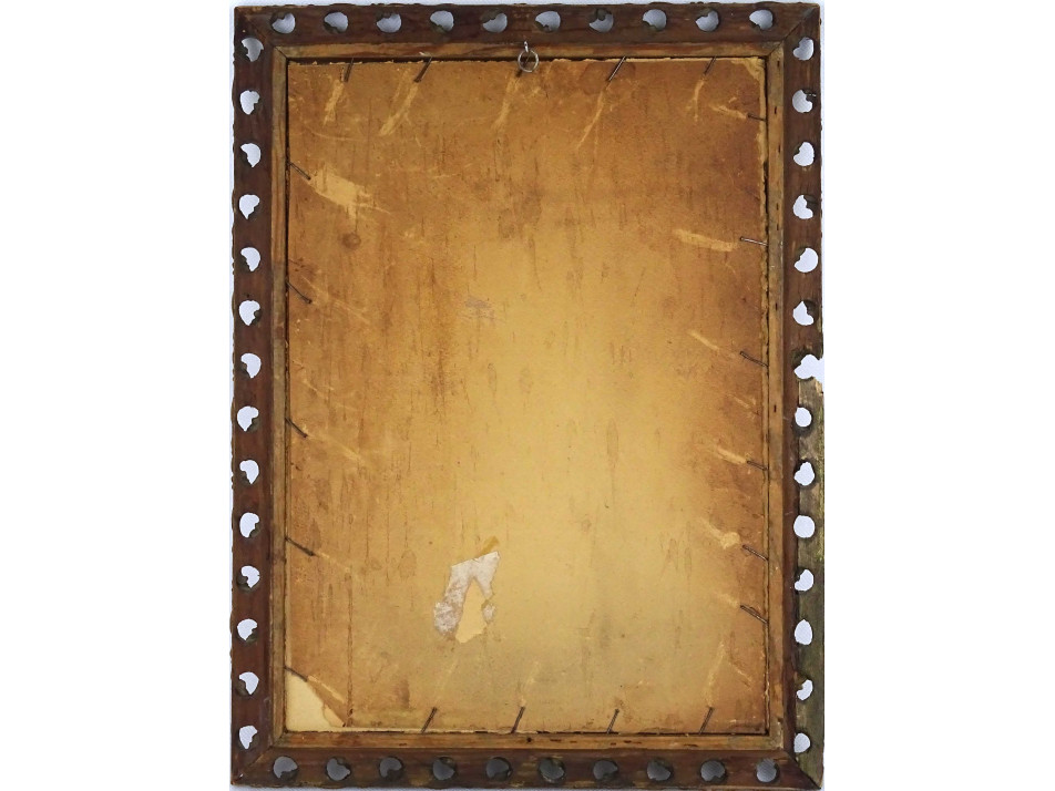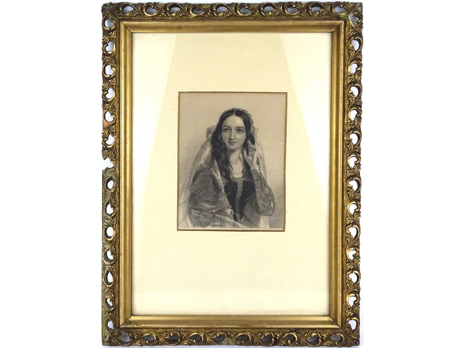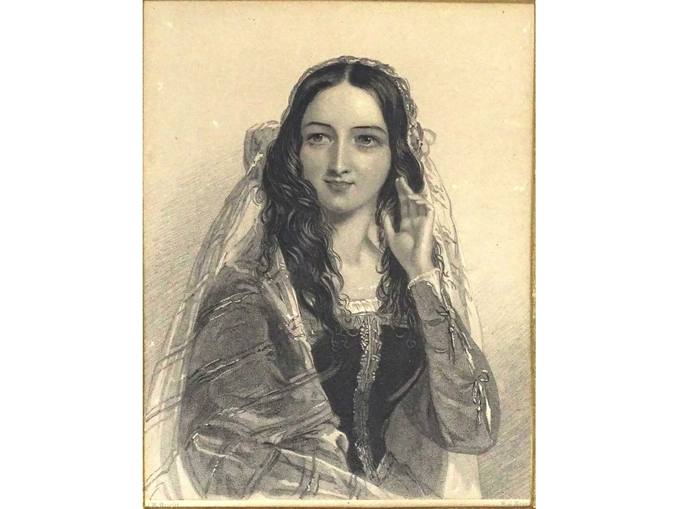 Szépen keretezett, paszpartuban és üveglap mögött található, fiatal nőt, menyasszonyt ábrázoló acélmetszet, női portré. Az aranyozott, áttört keret sérült.