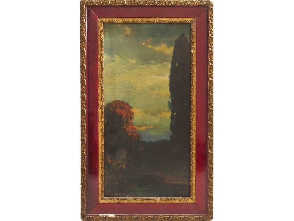 Régi, jelzett, olaj karton festmény, tájkép, szép állapotú, díszes, aranyozott szélű, bordó fakeretben.