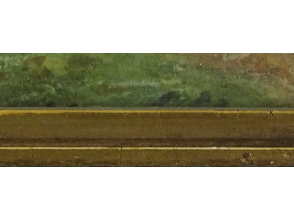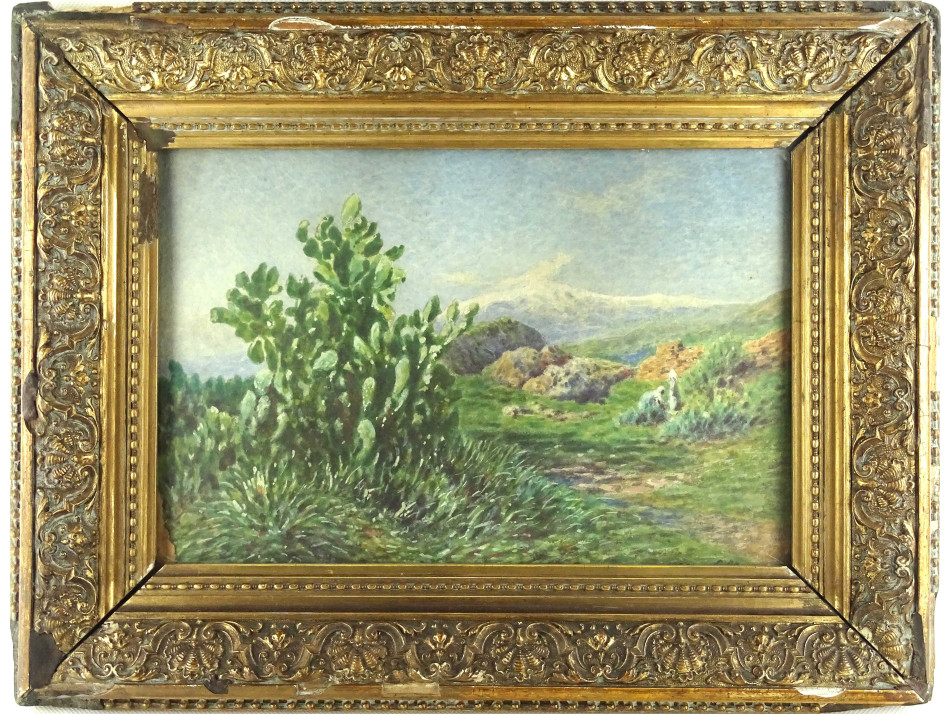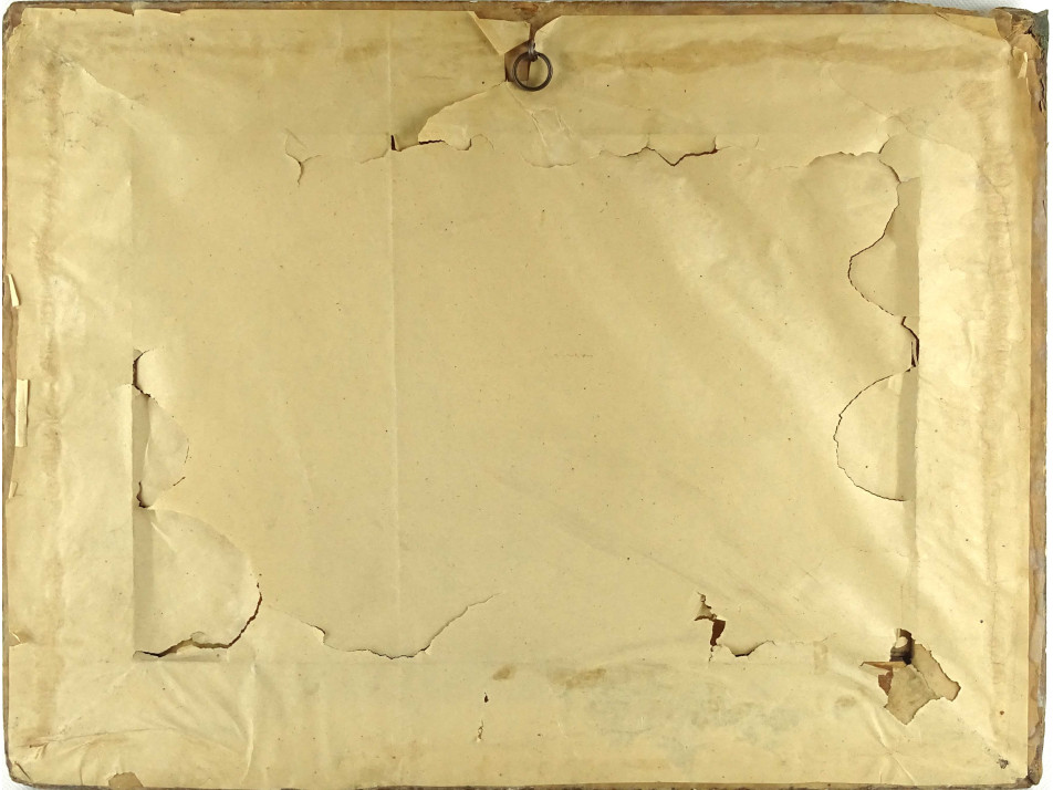 Régi, jelzetlen akvarell papír festmény, üveglap mögött, szép állapotú aranyozott díszes keretben. A kereten néhány apróbb sérülés látható.