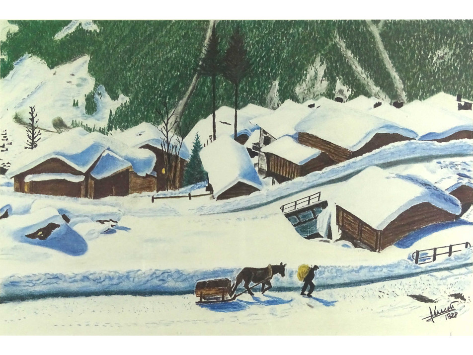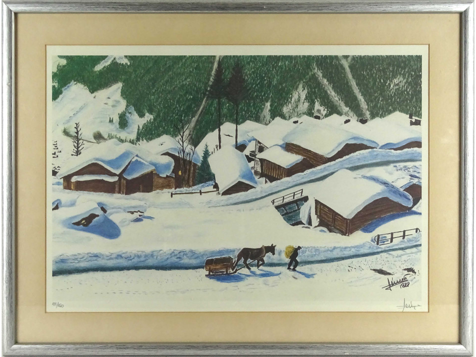 Falu télen - színes grafika, jelzett fotó nyomat