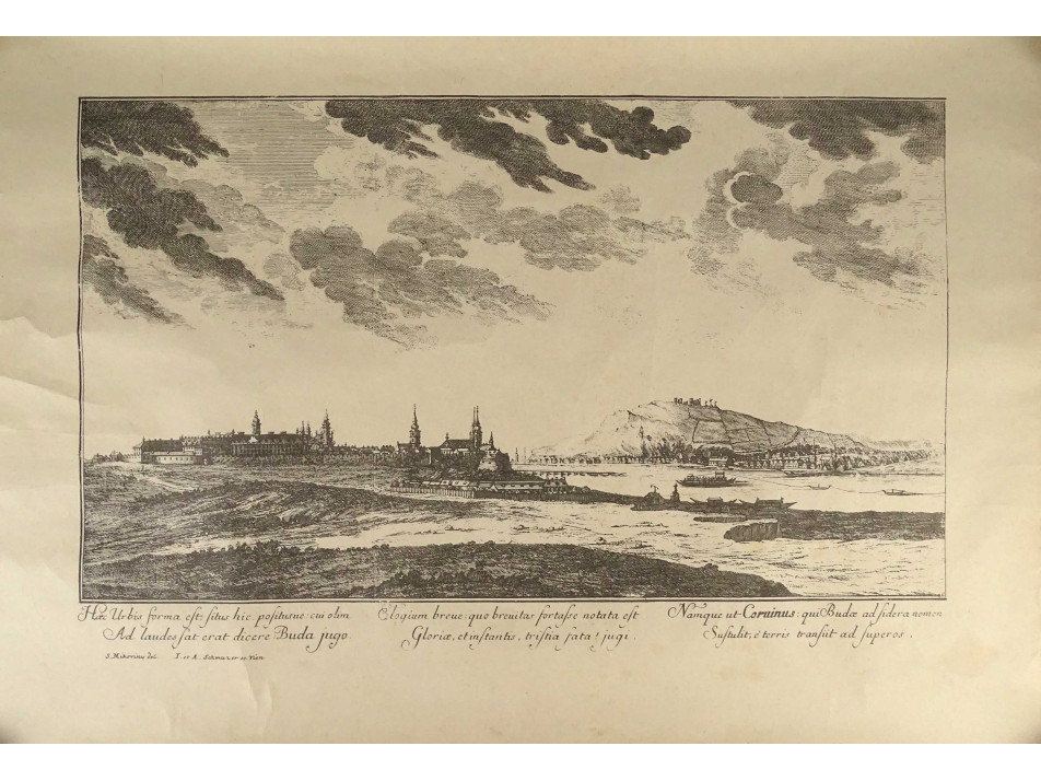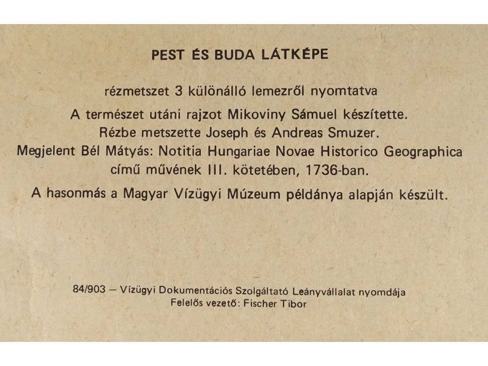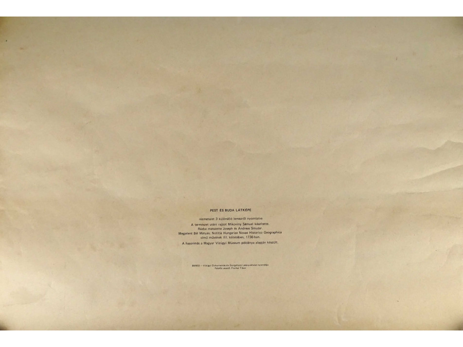 Bél Mátyás 1736-ban megjelent könyvében szereplő Pest Buda látképét ábrázoló rézmetszet nyomdai másolata, keret nélkül feltekerve tárolva.