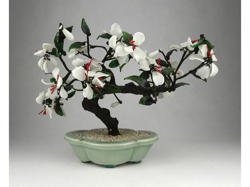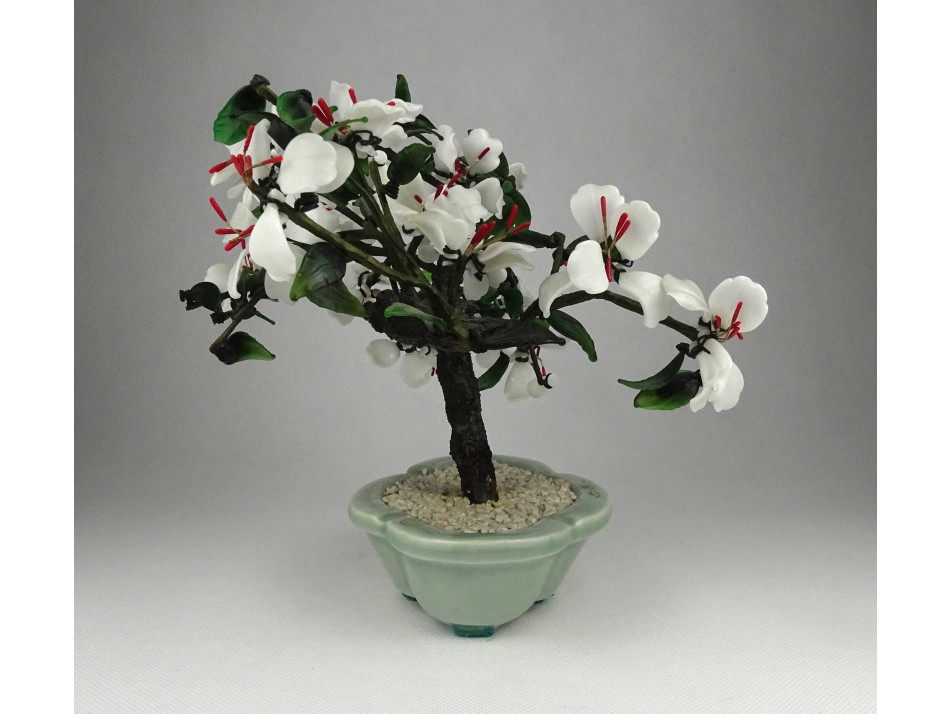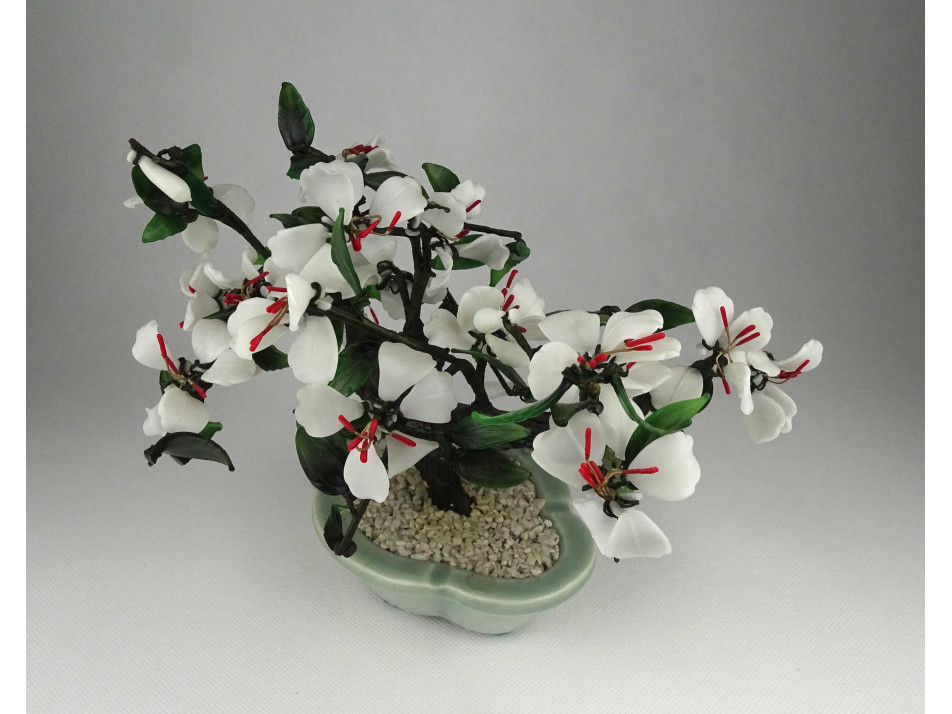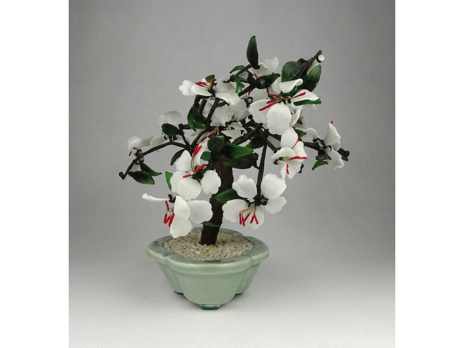 Szép állapotú, csiszolt, faragott kőzetekből és üveg szirmokból készült fa dekoráció. A fa tövében található apró dekor kövek rögzítve vannak, nem szóródnak le. Bonsai fa jellegű kőzet fa, lakásdekoráció, lakberendezési tárgy.