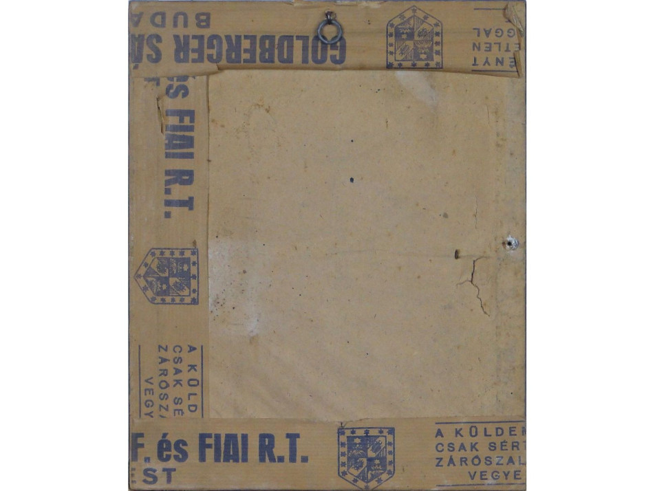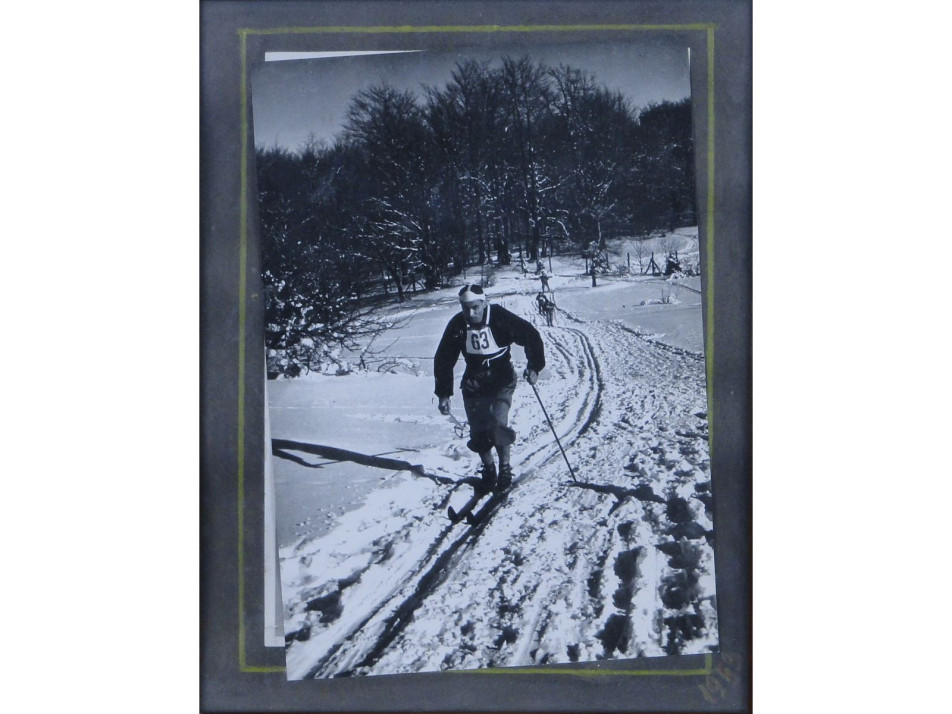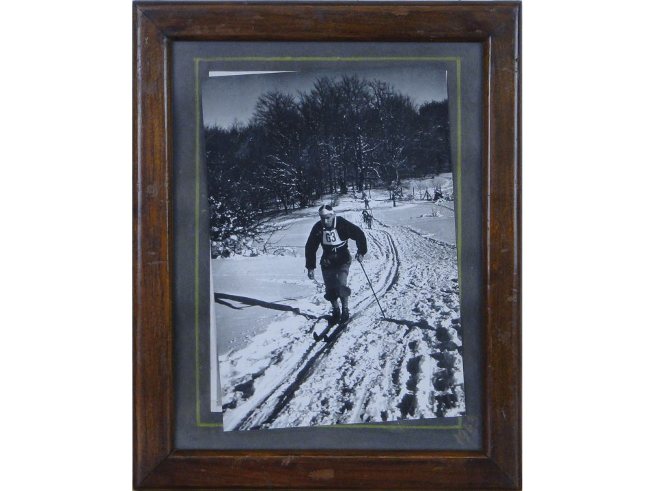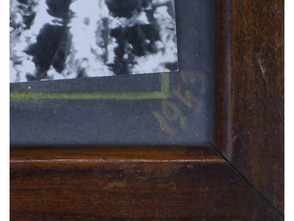 Régi barna keretben, üveglap mögött található régi fekete-fehér fotó, rajta síző férfiak. Hátoldalán falra akasztási lehetőség.