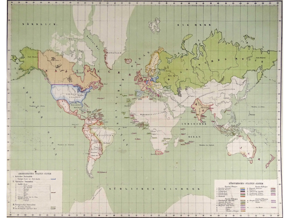 Régi, szép állapotú, német nyelvű, színezett Föld térkép. Rajta a 19. század közepén létező országok és országhatárok.