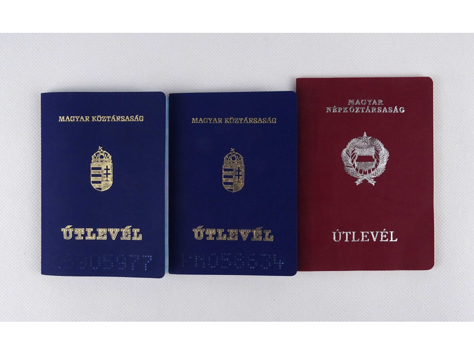 Szép állapotban megmaradt magyar útlevelek. Két darab kék, Magyar Köztársaság által kiadott és egy piros, amit még a Népköztársaság bocsátott ki.