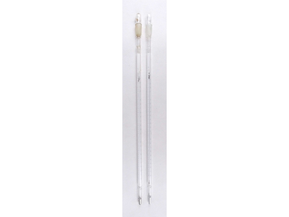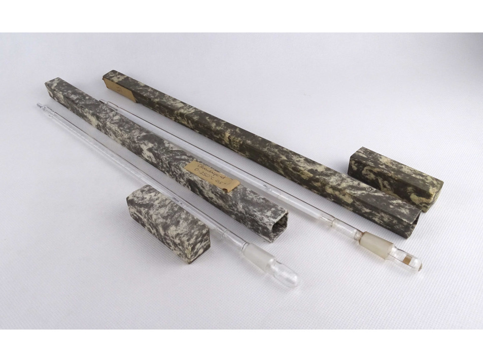 Két darab, régi, eredeti dobozában található, hibátlan állapotú nagyméretű, laboratóriumi hőmérő, labor felszerelés.