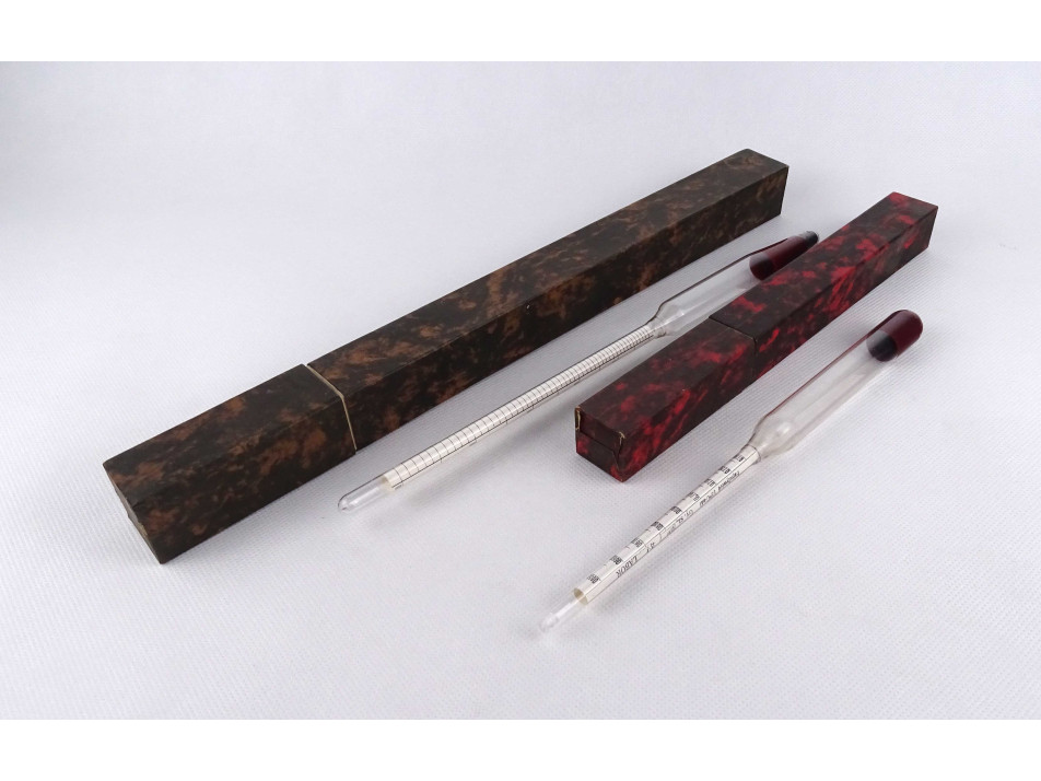 Két darab különböző méretű régi, eredeti dobozában található, hibátlan állapotú LABOR márkájú fajsúlymérő. Méretik: - 24 x 1.8 cm - 30.5 x 1.9 cm