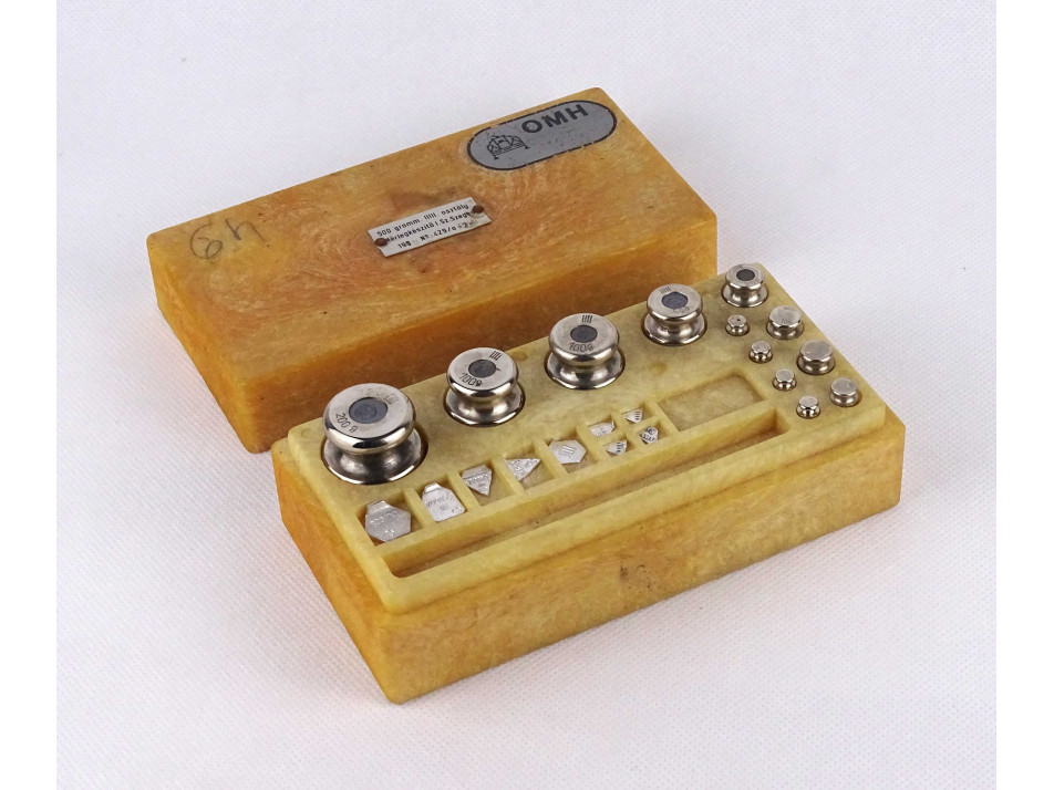Patikai, laboratóriumi, gyógyszerész súlykészlet, eredeti műanyag dobozában.