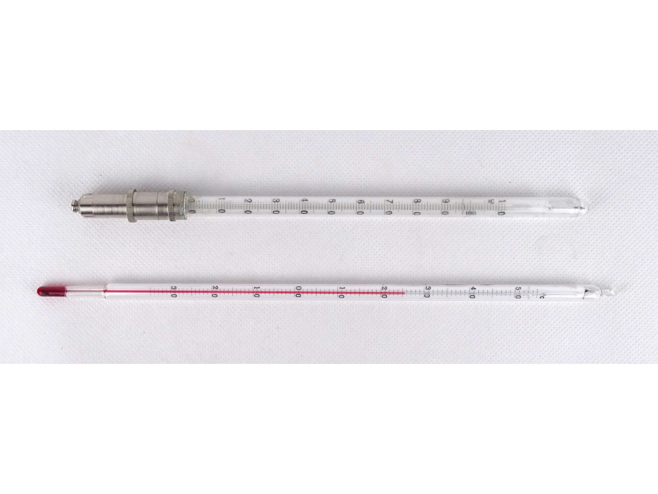 Két darab, régi, eredeti dobozában található, hibátlan állapotú, nagyméretű laboratóriumi hőmérő, labor felszerelés.