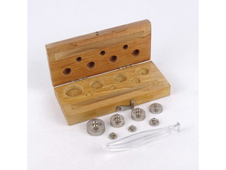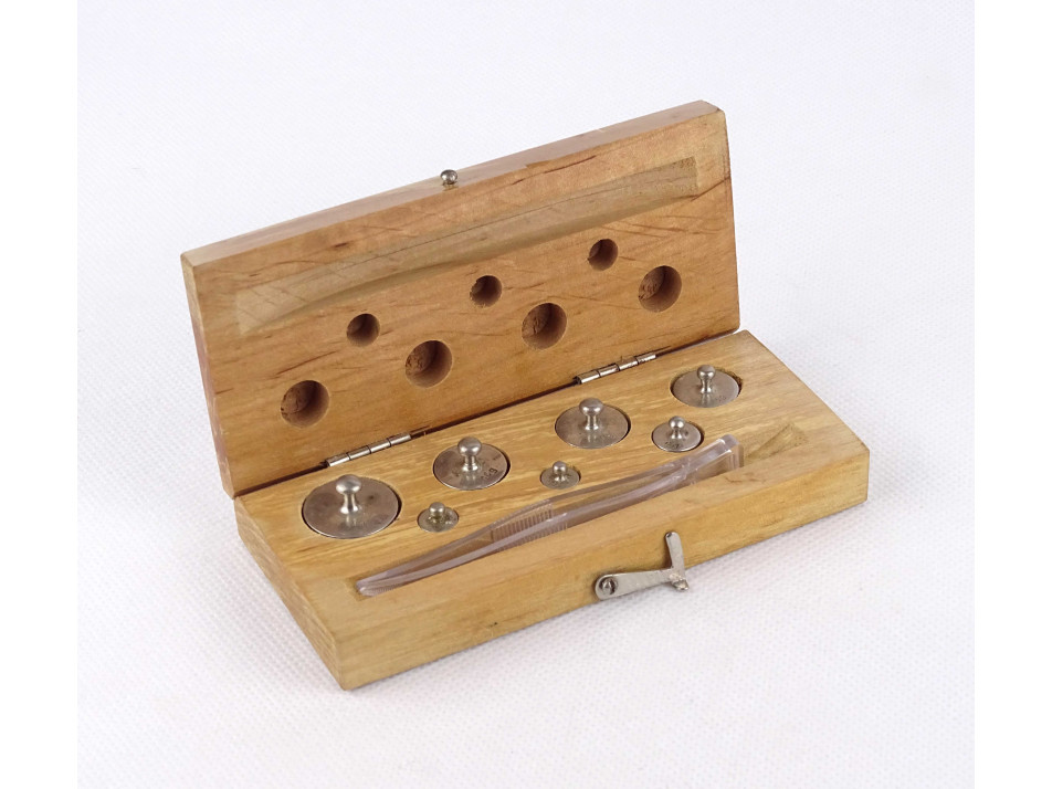 Teljes, patikai, laboratóriumi, gyógyszerész súlykészlet, eredeti fa dobozában.