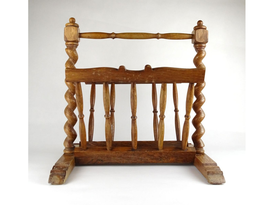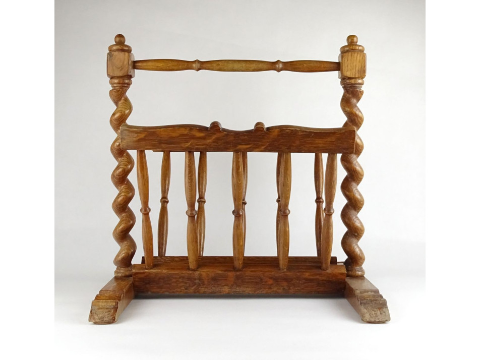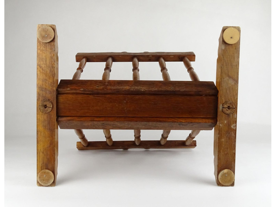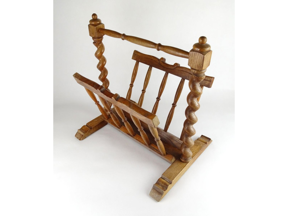Hibátlan állapotban lévő hord füllel rendelkező fa újságtartó.