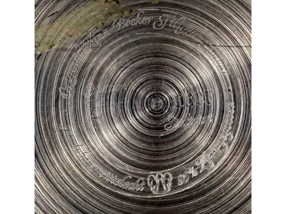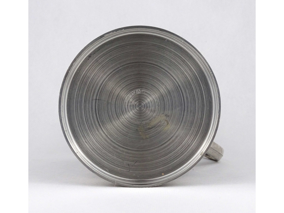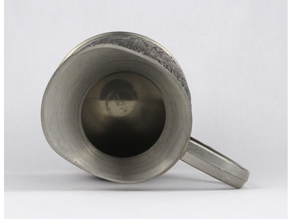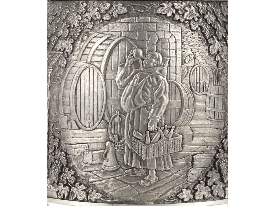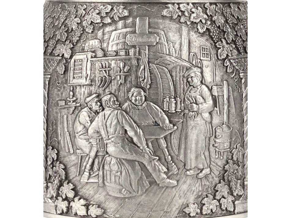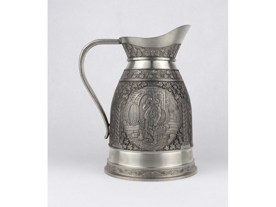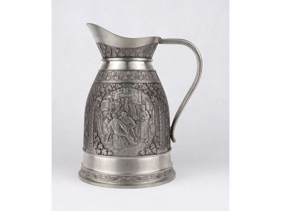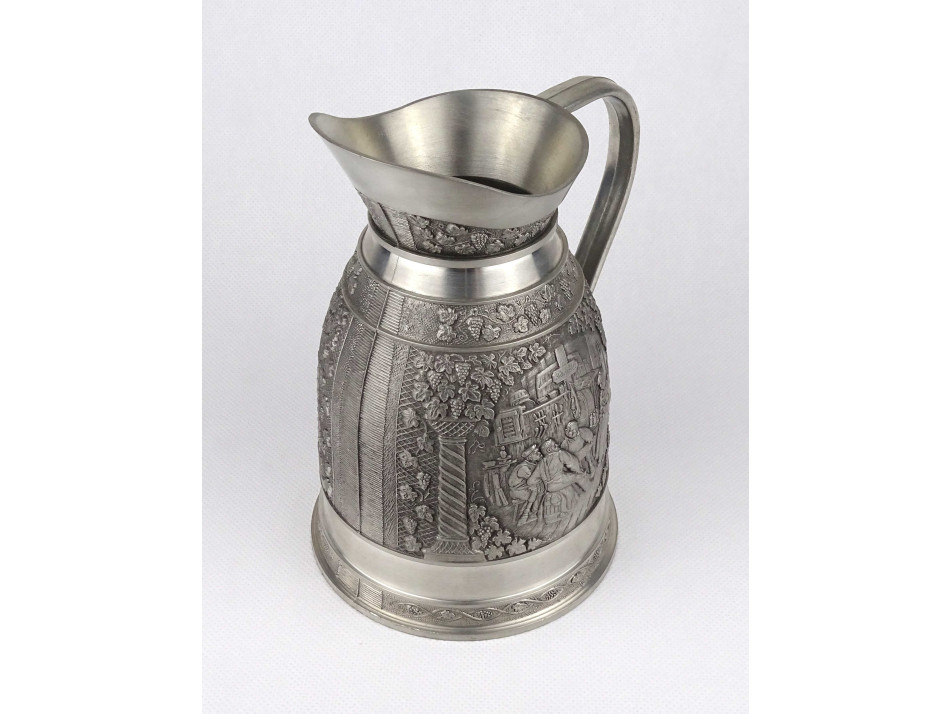 Hibátlan állapotú, jelzett, német, jelenetes ón kancsó, bor kiöntő. Körben gyönyörű domborműves, szőlőleveles díszítés látható.
