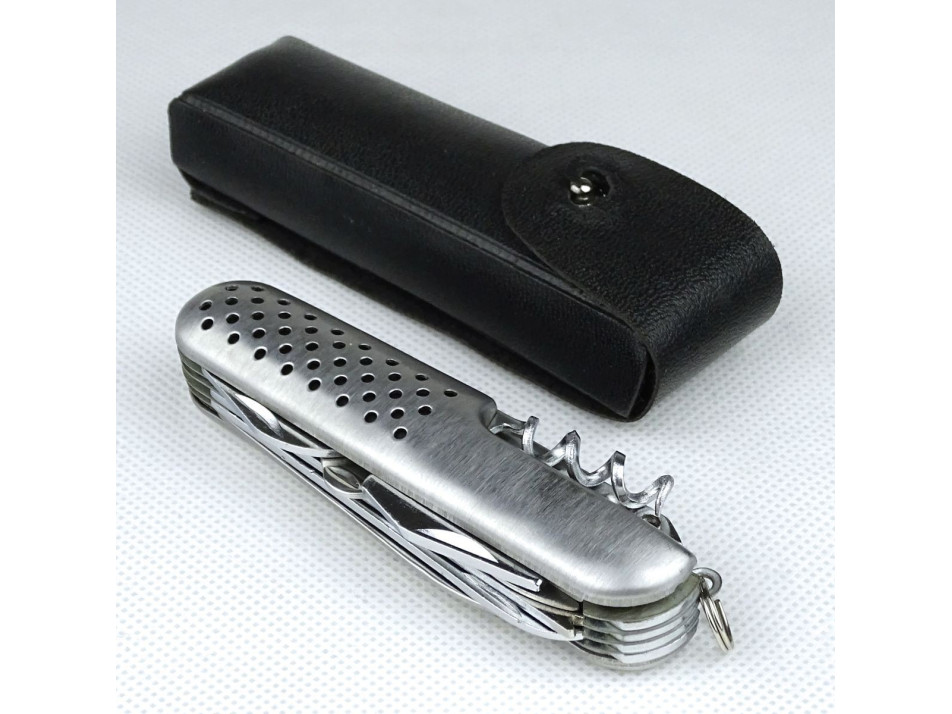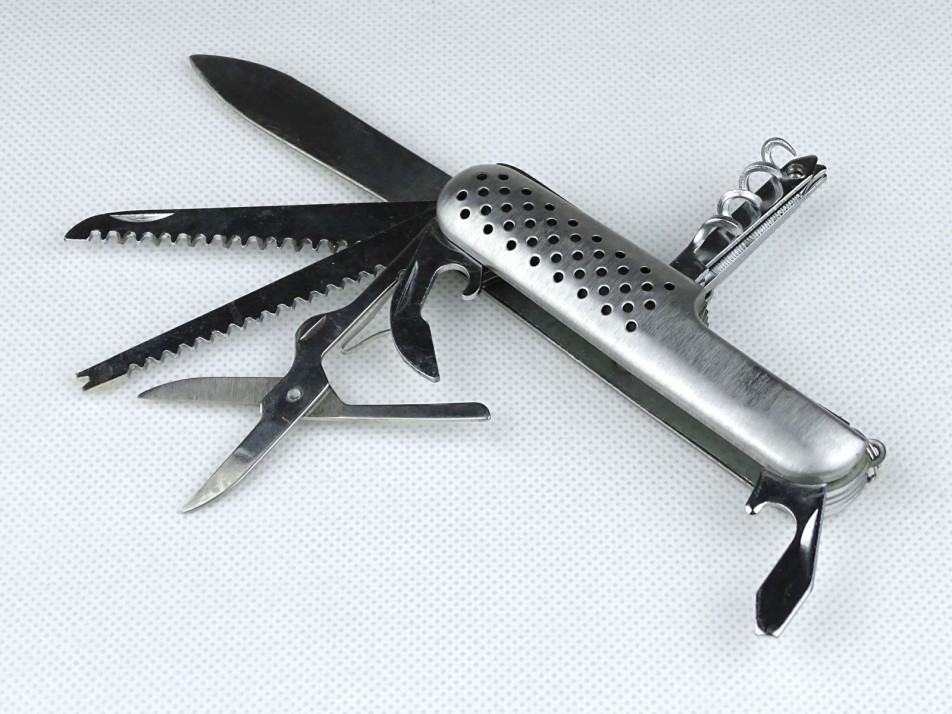 A késen található dugóhúzó, kétféle konzervnyitó, olló, fűrész, reszelő, csavarhúzó és több speciális szerszám.