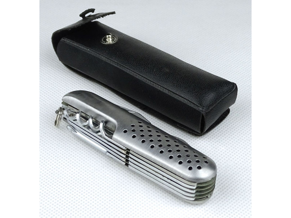 Jó minőségű svájci licenc alapján gyártott masszív erős 11 funkciós zsebkés, bicska szép állapotú eredeti tokjában.
