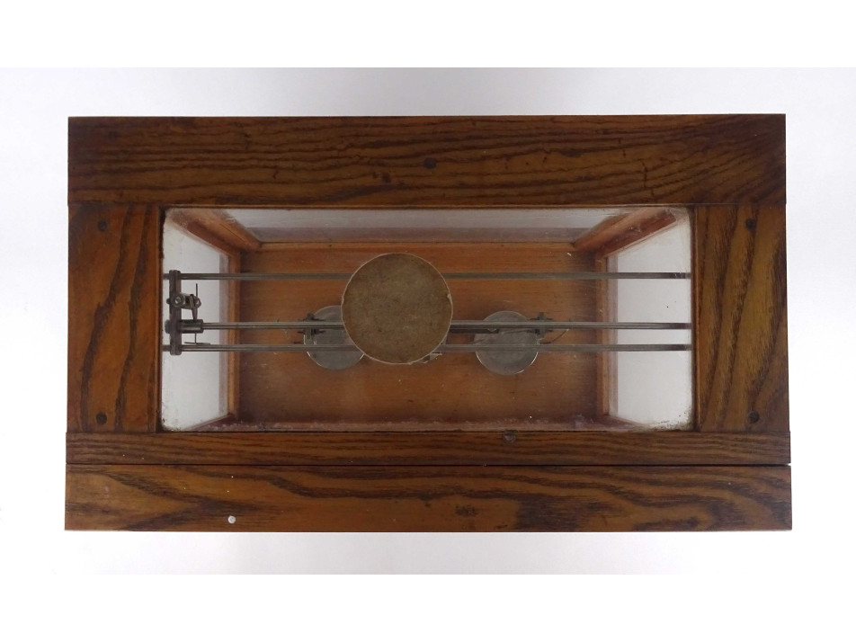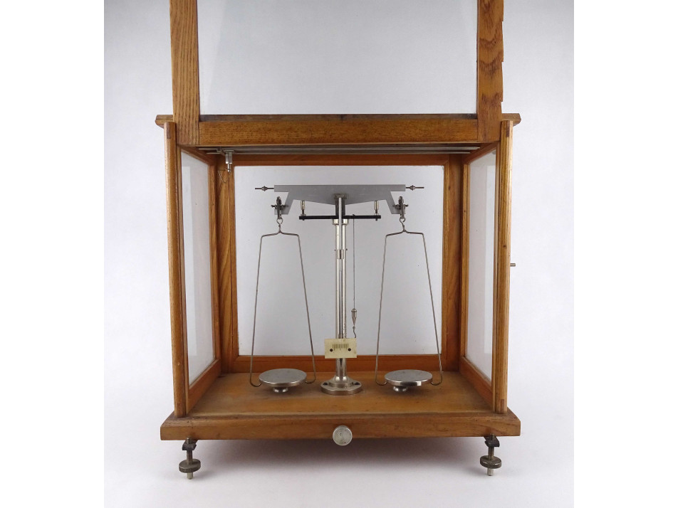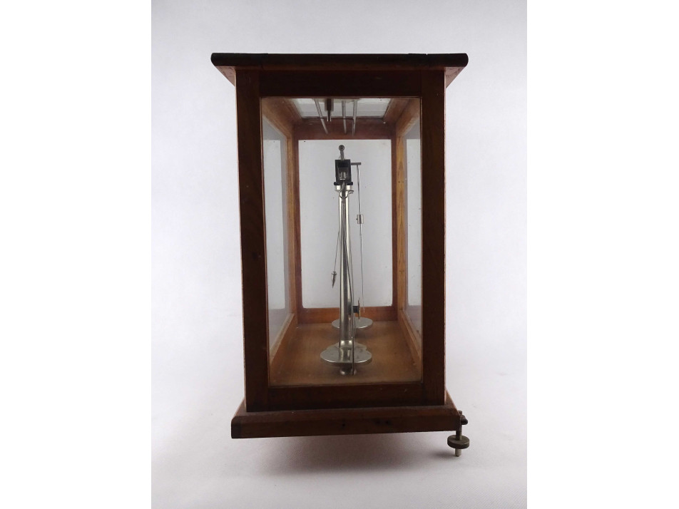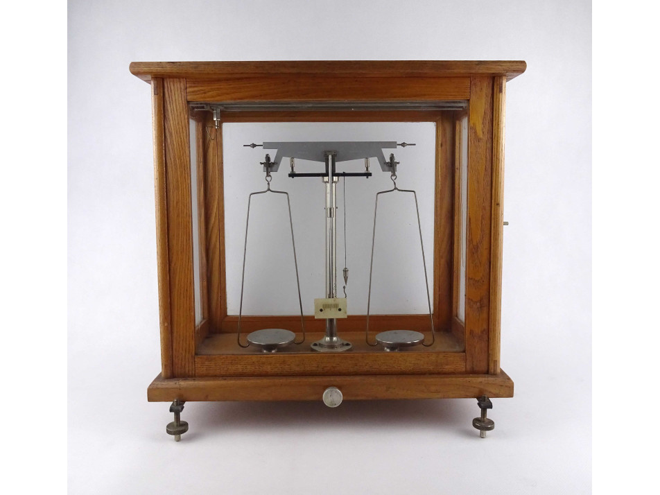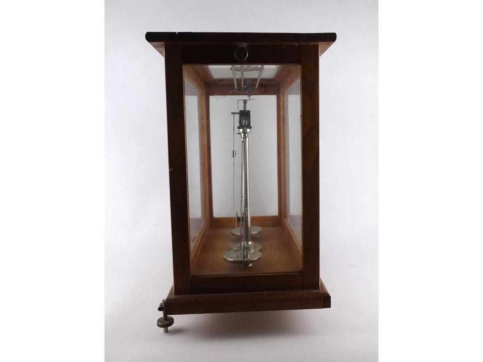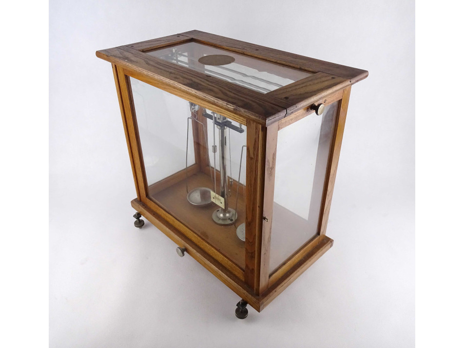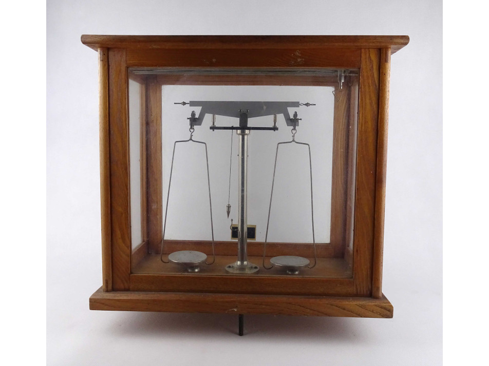 Régi szép állapotban megmaradt, precíziós, kéttálcás laboratóriumi, patikai, gyógyszertári mérleg, fa szerkezetű üveg falú zárható dobozban.