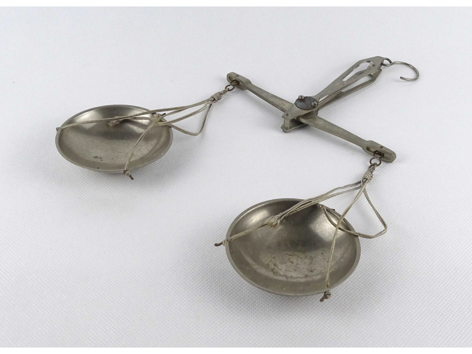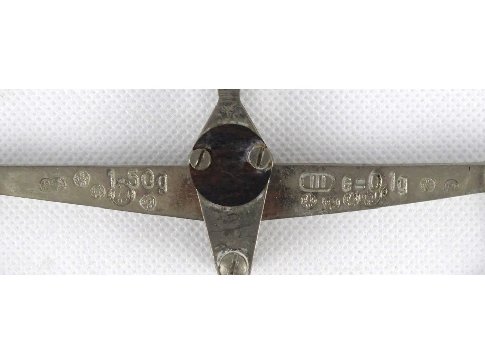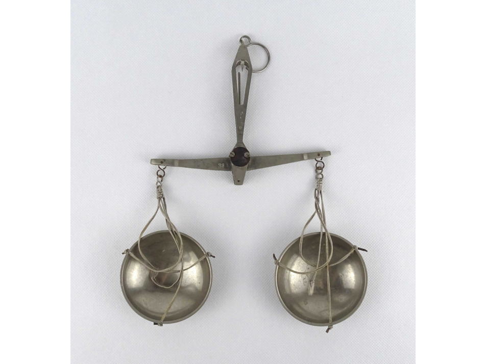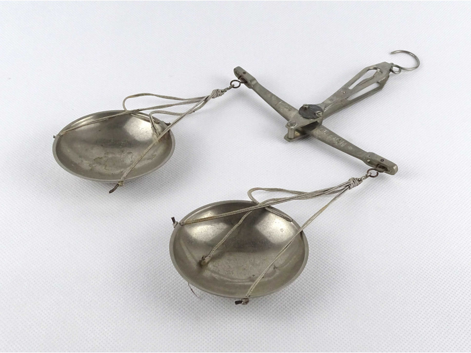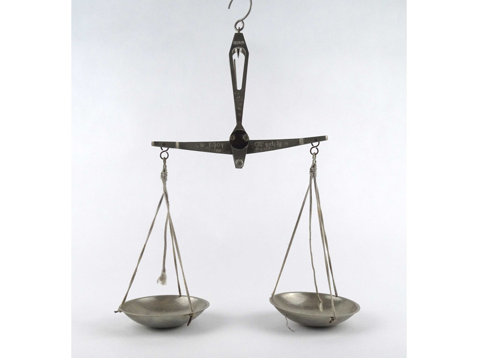 Régi, kétkaros pici mérleg, kis méretű patika mérleg. Akasztóval és fém csészékkel rendelkezik. A karokon számos hitelesító pecsét található